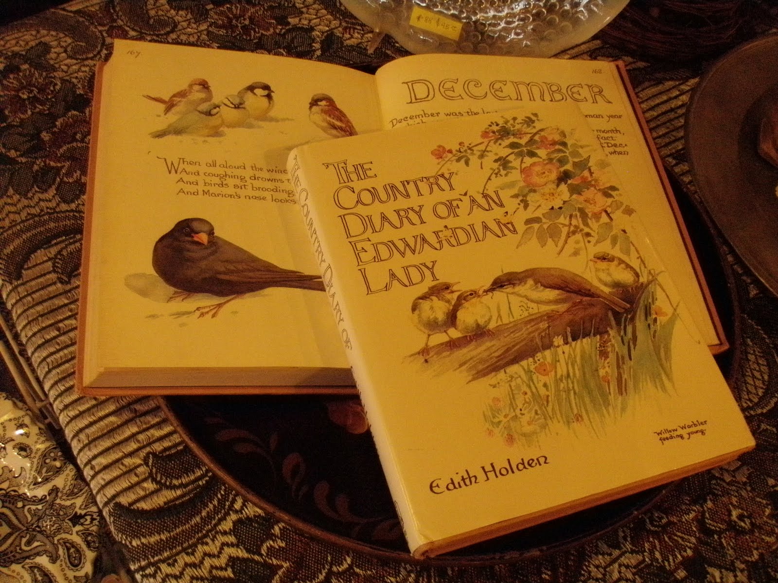 Many of you remember THE COUNTRY DIARY OF AN EDWARDIAN LADY published in the early 80's, now out of print. Edith Holden was an early sort of 'concept' blogger minus the computer. She kept a log, but the only web would have been the spidery kind. She had such a need to share the beauty surrounding her that she drew her own images, gathered her own research, and meticulously hand lettered each post! Whom did she imagine would ever get to appreciate her wonderful project when it was finished at the turn of the LAST century? We always try to have a copy of her lovely work, and it's striking how respectfully cared for these gorgeous old books have been. A whole new audience is beginning to discover her nature drawings again.