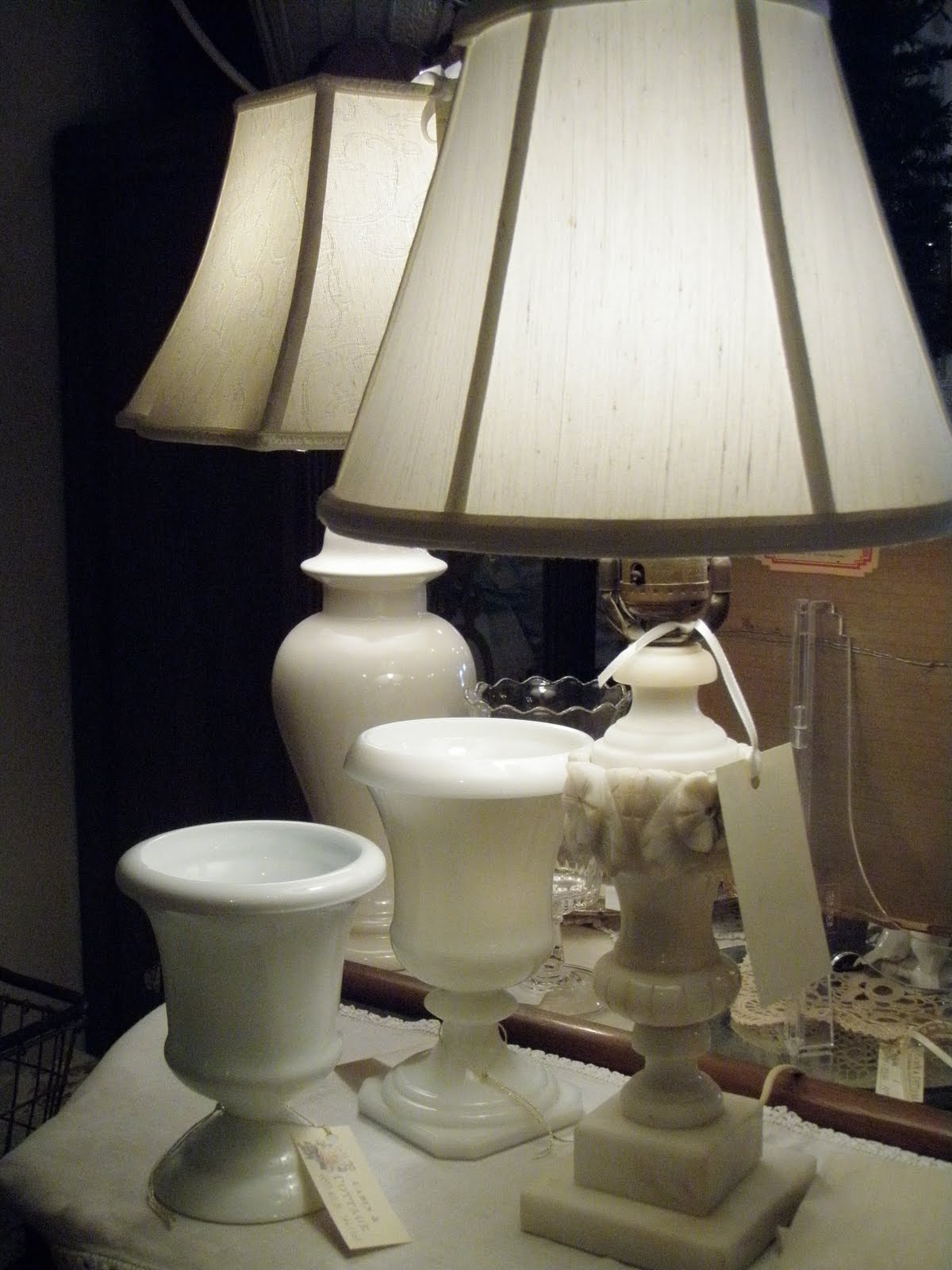 Alabaster lamps and milk glass urns make terrific accessories for an all white setting.