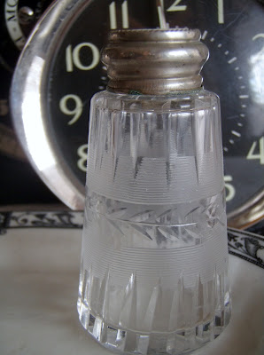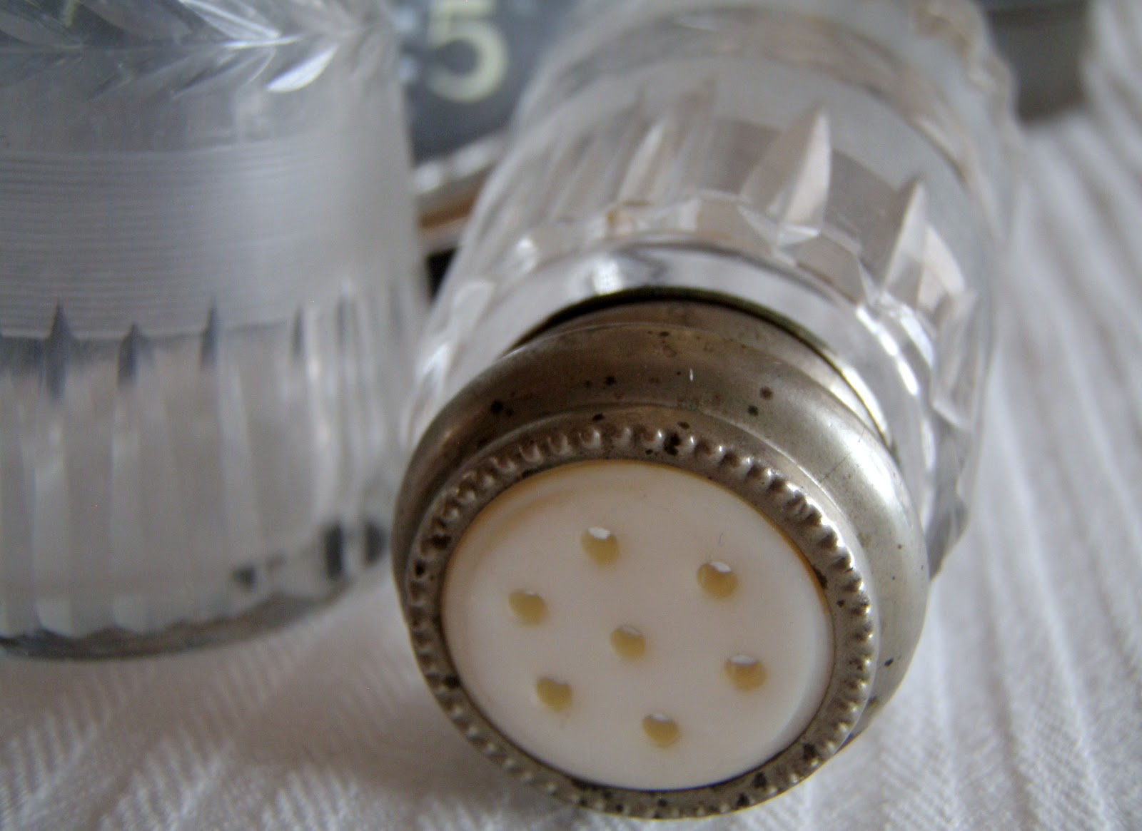 My favorite first! Mother-of-pearl and silver, cut crystal shakers. Happiness in a bottle! Or two!