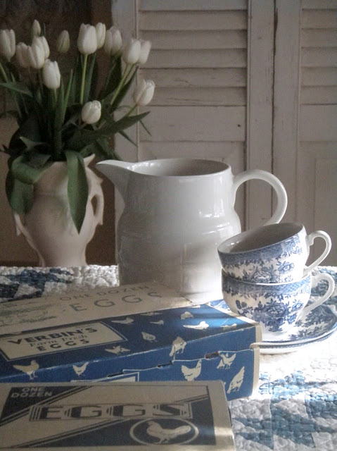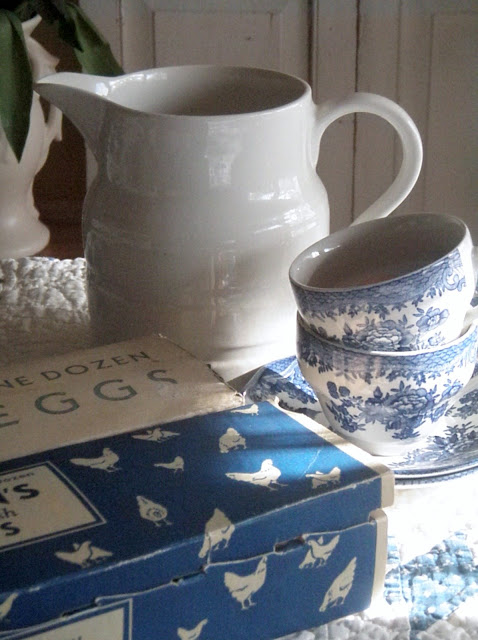 Sweet sweet photos. I love the blue and white quilt, egg cartons and dishes. I've never seen egg cartons like these before with their sweet images. Have a beautiful week Jacqueline! Hugs, Pamela