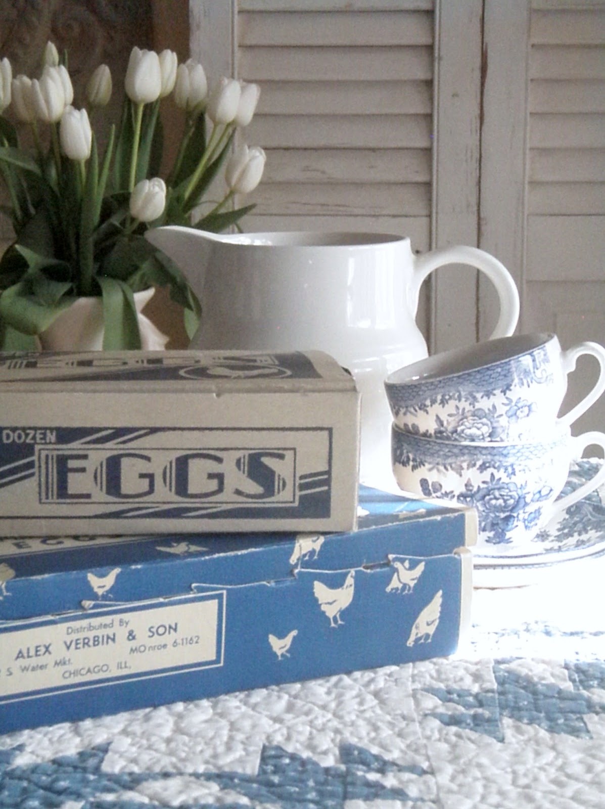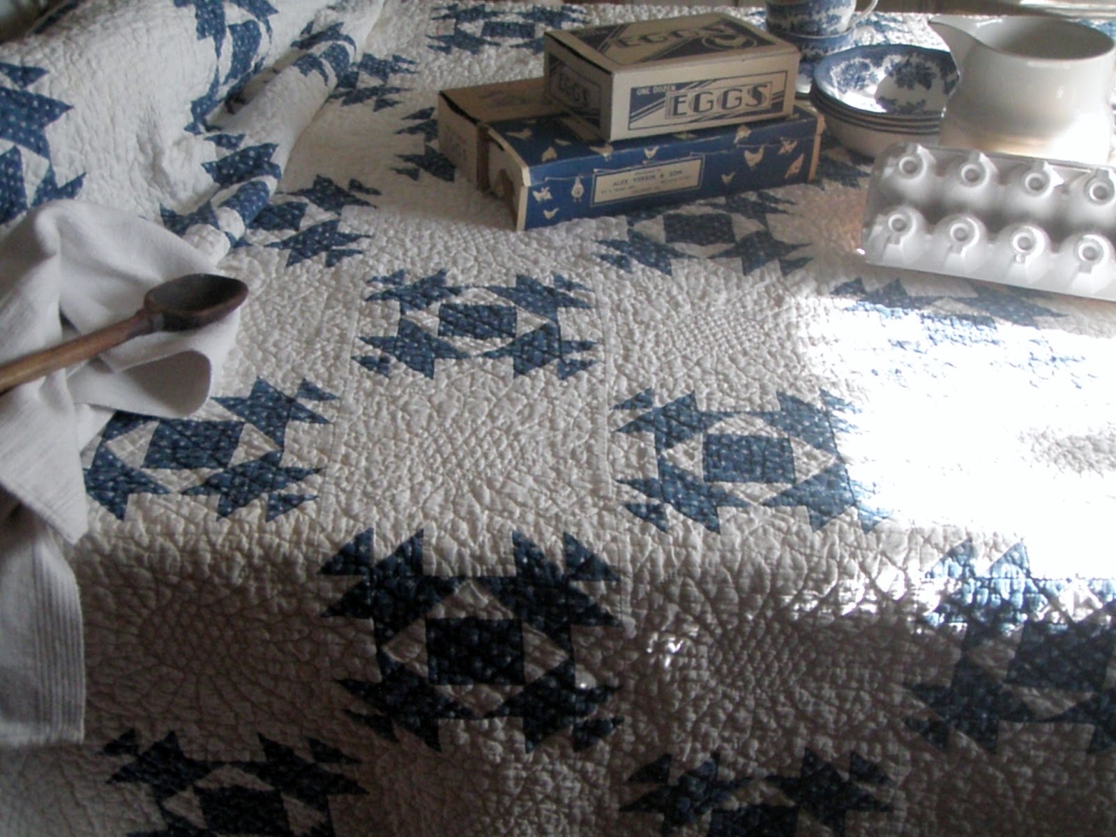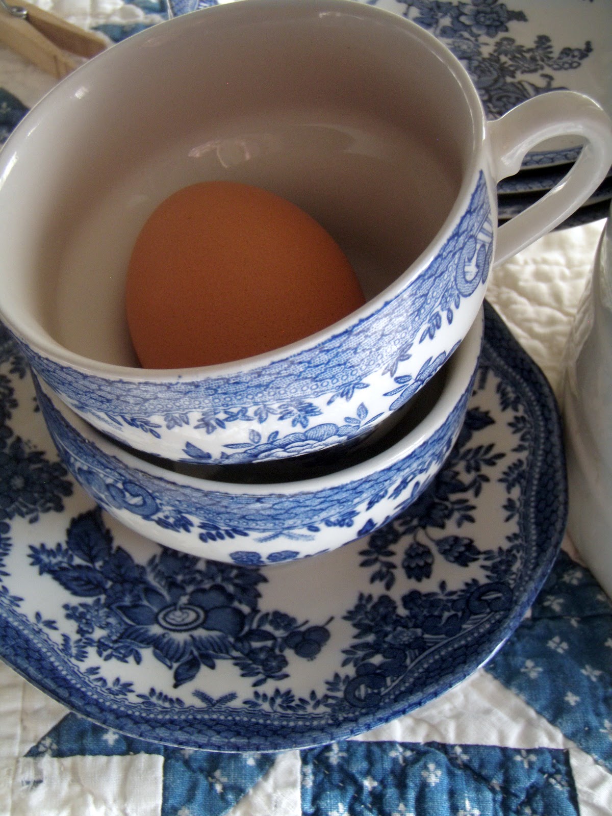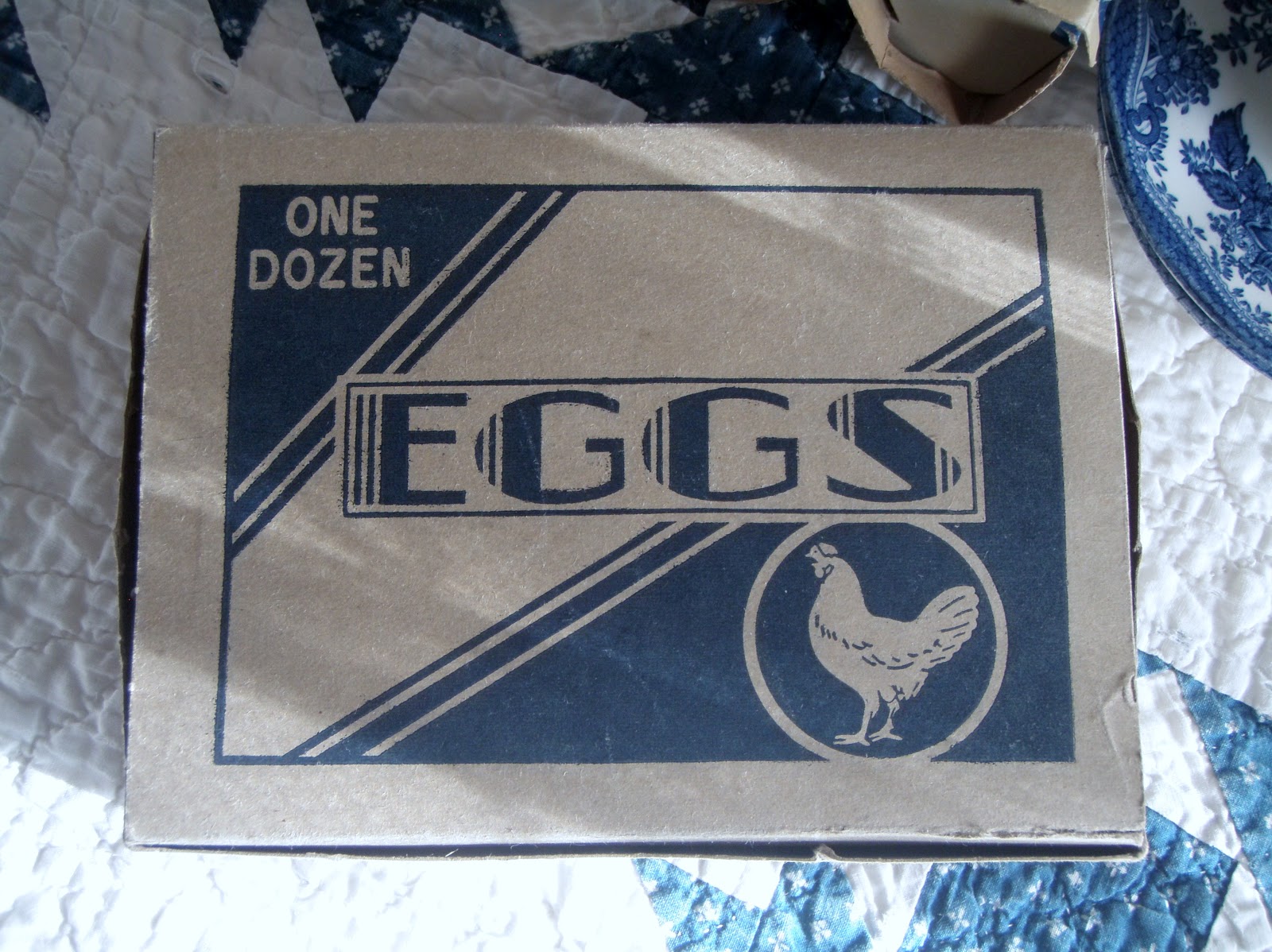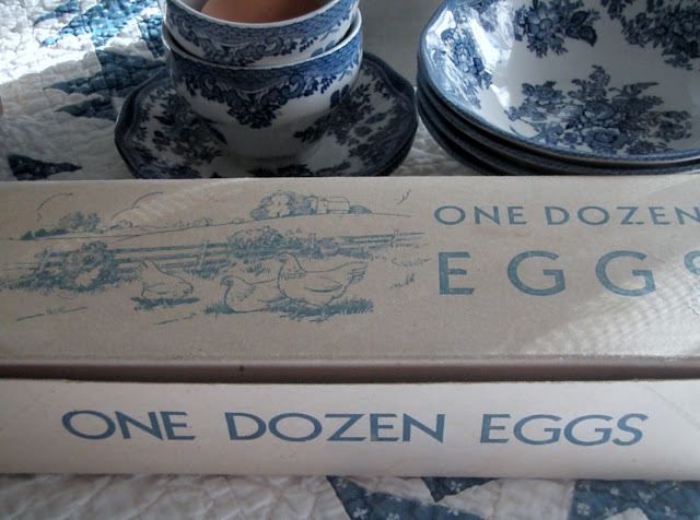 Great post and of course, I love your blue and white -- very pretty cups and saucers! The egg cartons bring back memories -- egg cartons used to be so much nicer! The quilt is TDF as well!
