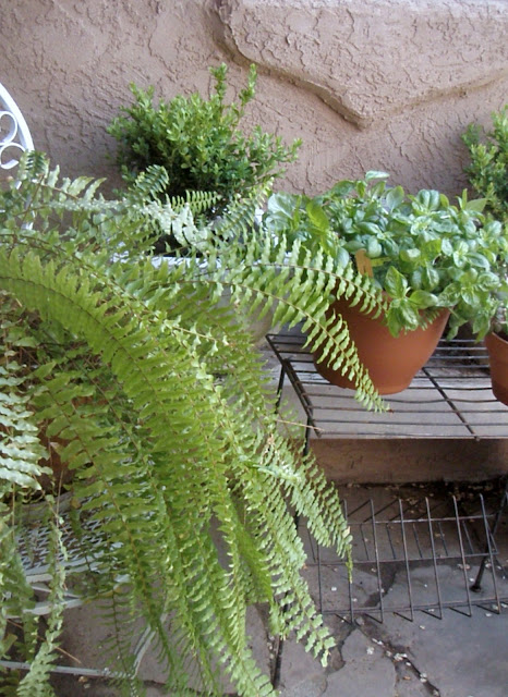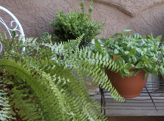 Lovely views of your patio! I adore the niche! That pot full of basil needed to be in my salad tonight! YuM! Dusty Miller has such a lovely silvery glow and at night it's illuminating! I admire how you mix the rustic with the pristine! On the Prairie the temperatures are sweltering on the west side of our deck. I, too, love the early mornings and late evenings there!