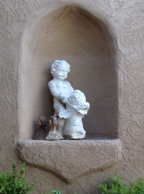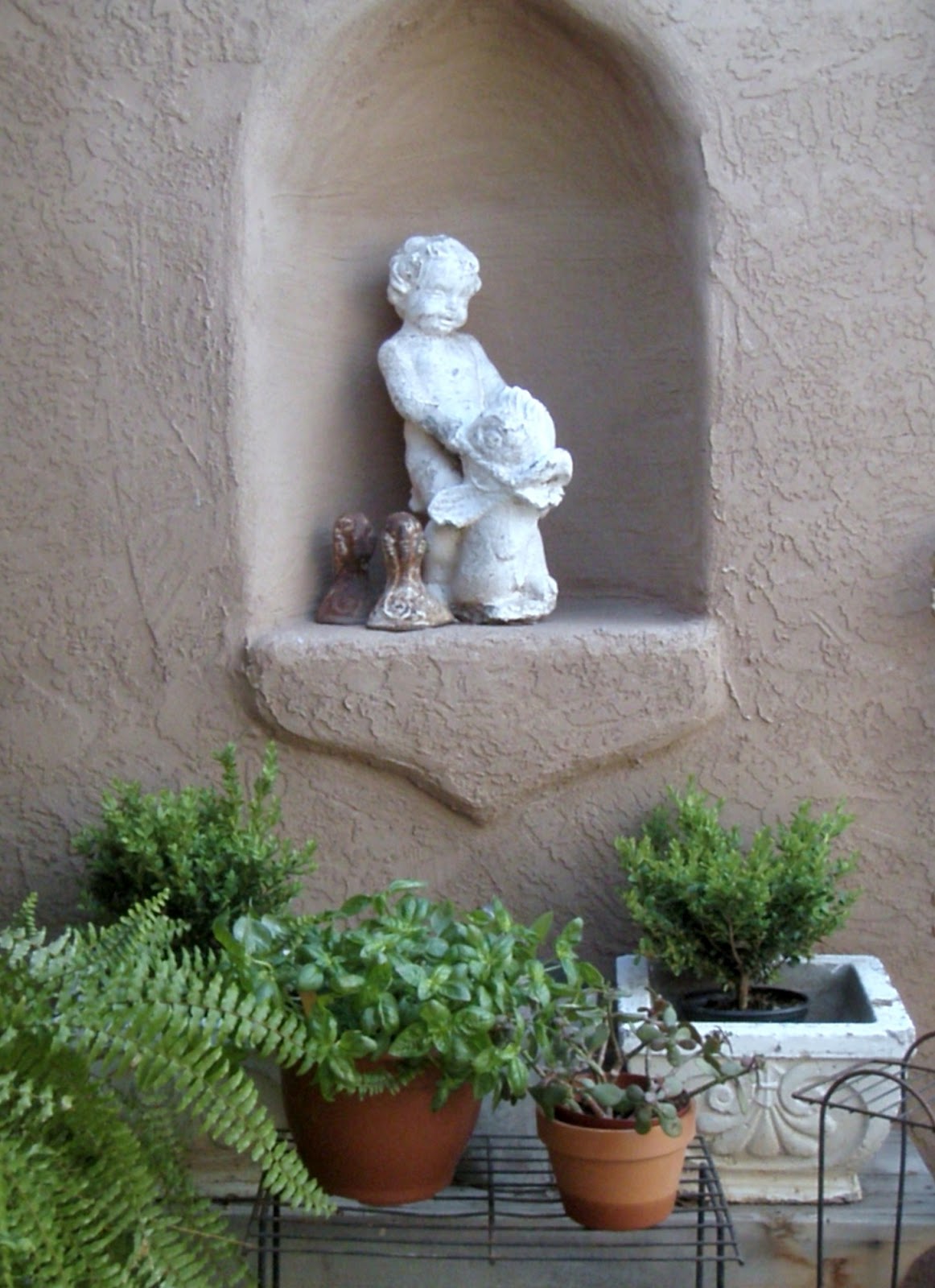 Your patio looks so beautiful Jacqueline. I love the deep terracotta on the wall and the niche with the statue.