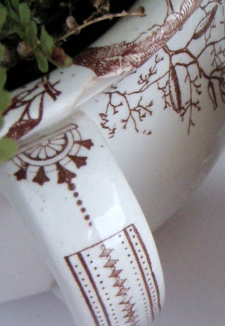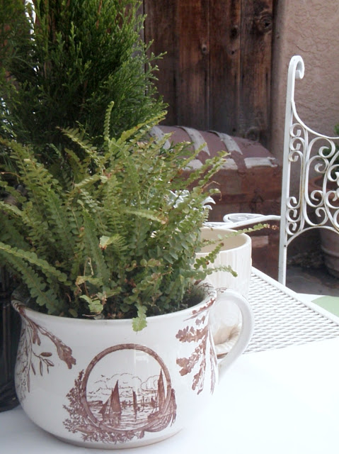 Your patio is looking really nice. I like the chamber pot with the brown transfer.