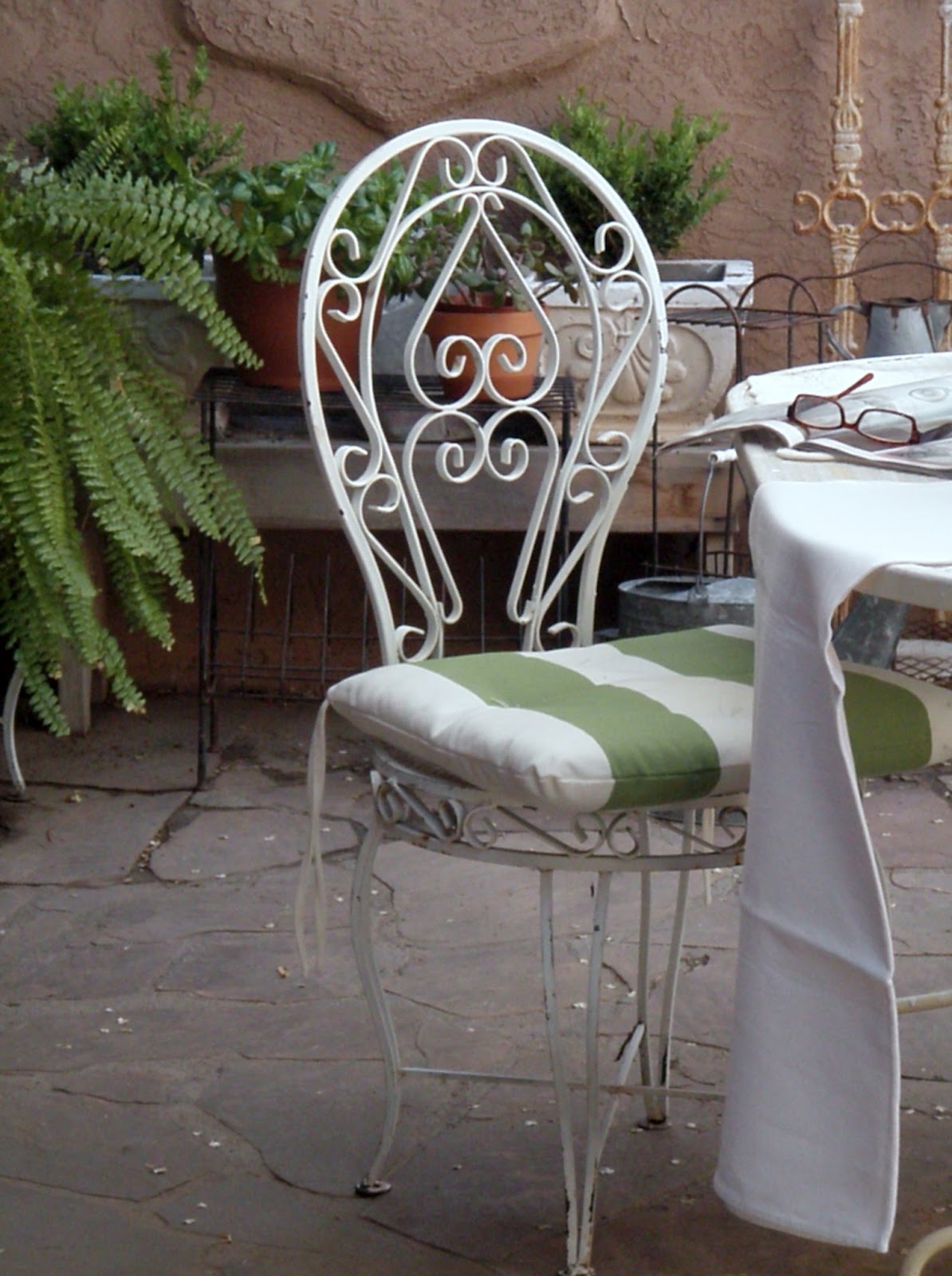 What a wonderful little oasis you've created on your patio! Love that little green and white stripped chair seat, and the way your glasses are sitting on the table, like you were just sitting there reading and enjoying the space...