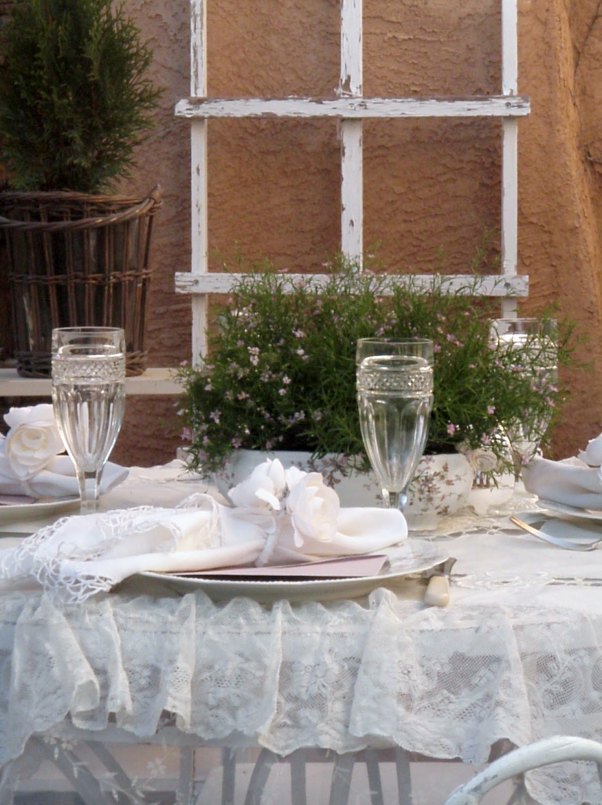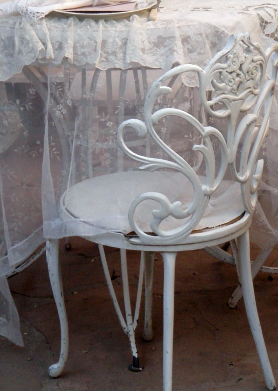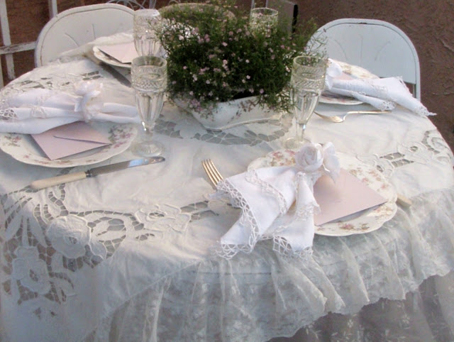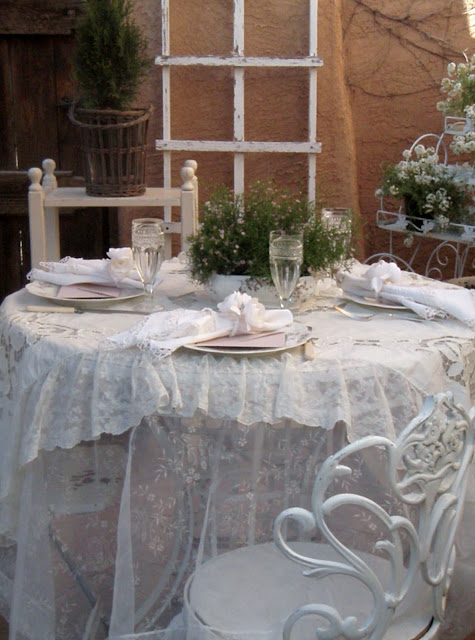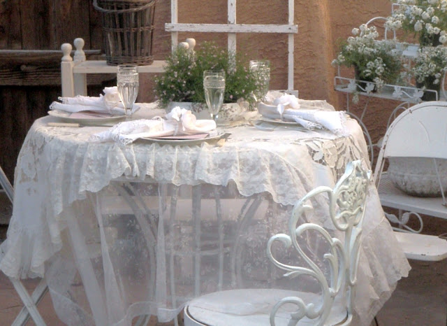 Beautiful frothy lace, silver spoons, cyrstal . . . Who wouldn't love to sit at this table? It's elegant, but yet very cozy. Love your patio, too!