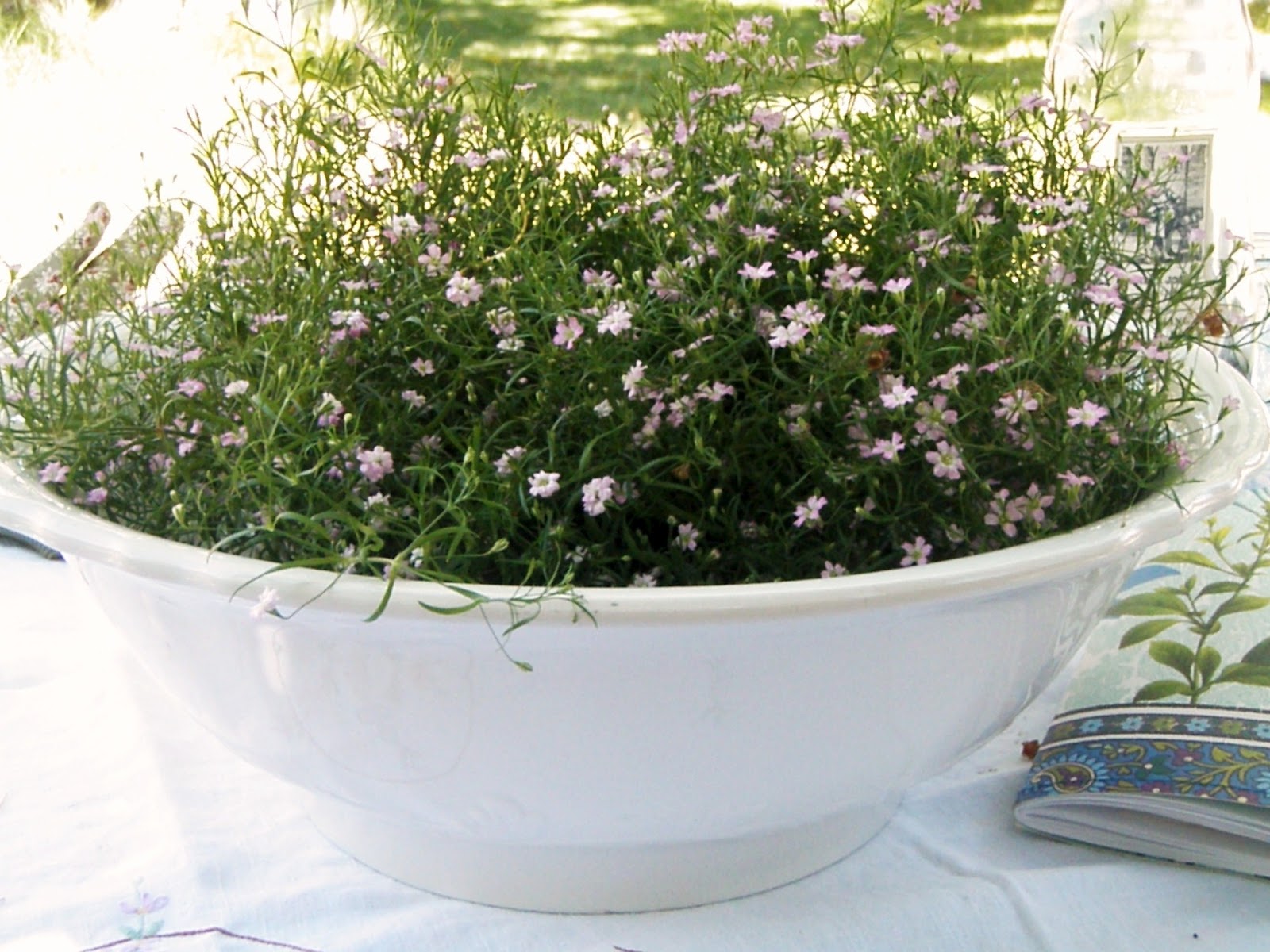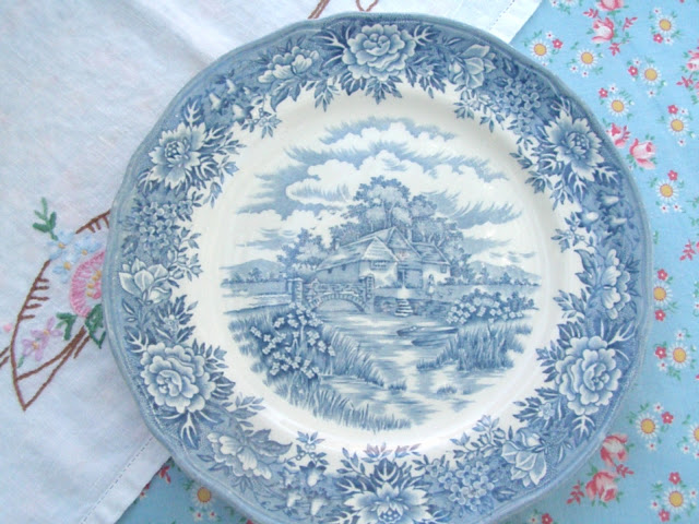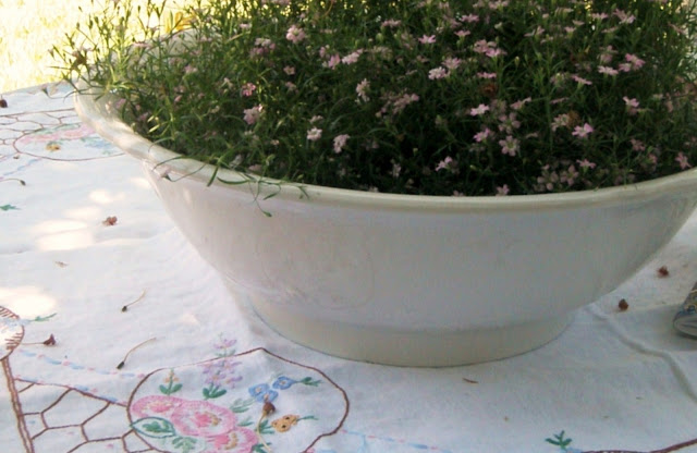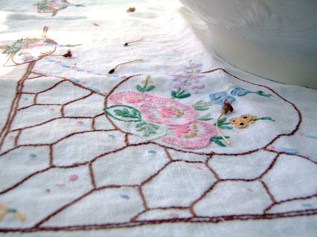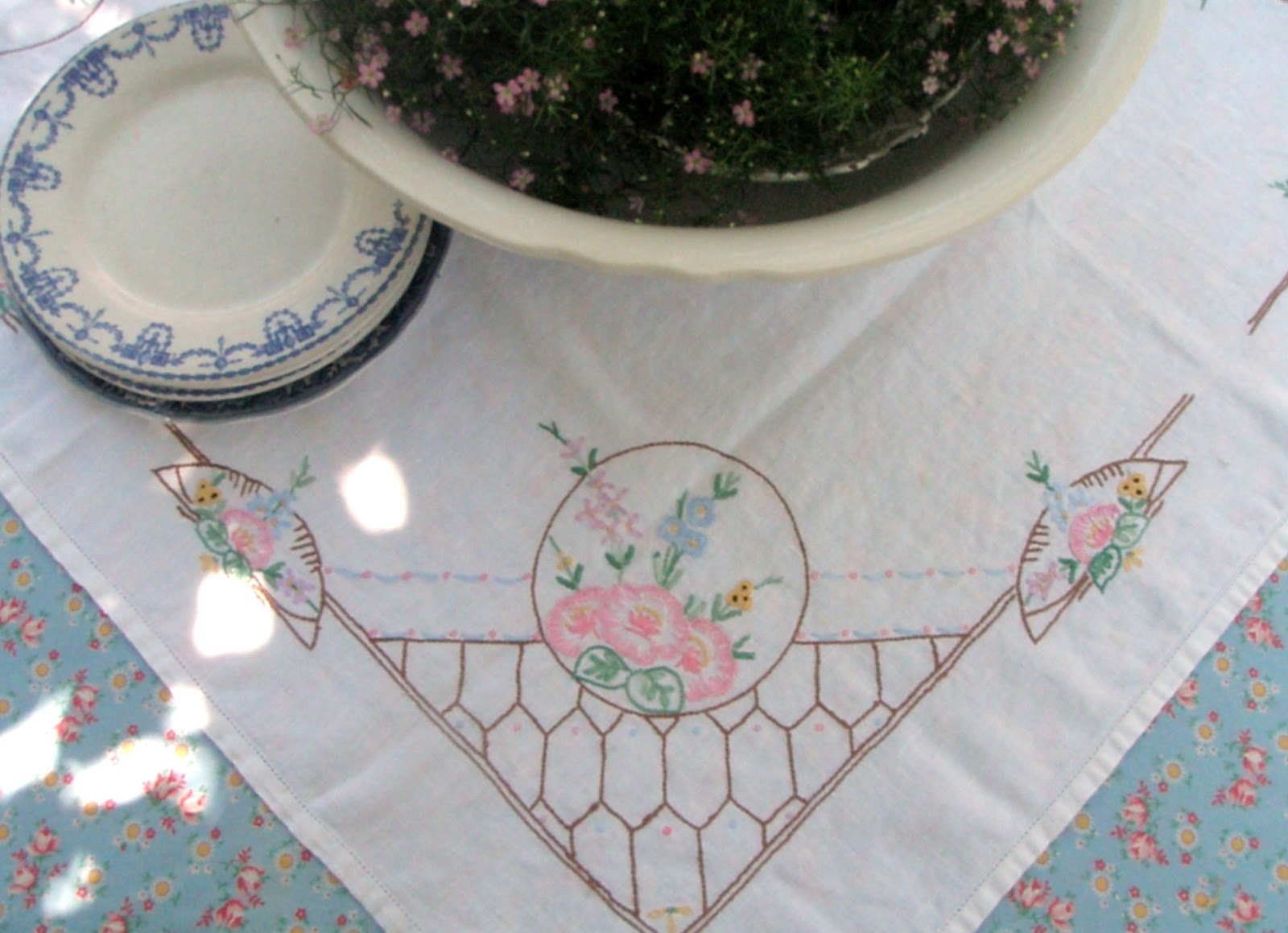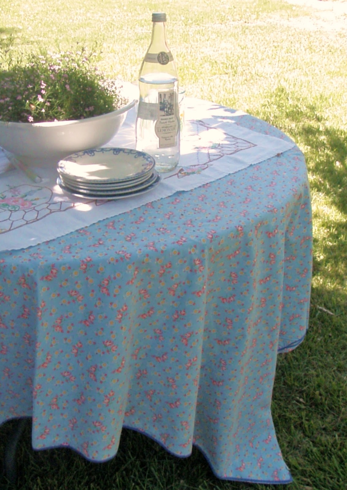 country cottage underneath. This time the table is draped with a vintage duvet cover from Belgium, with an embroidered vintage tea cloth on top. A mix of blue plates for snacks completes the picture. Lazy, quiet, shady, and sweet. . . .
