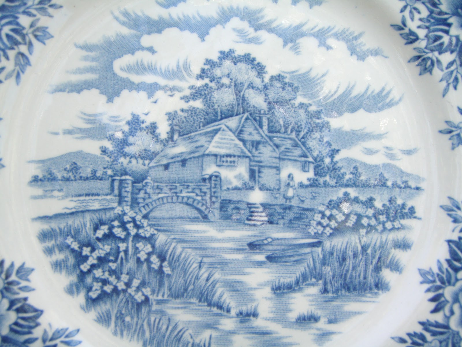 Ironstone transferware plates and a sturdy basin for flowers.