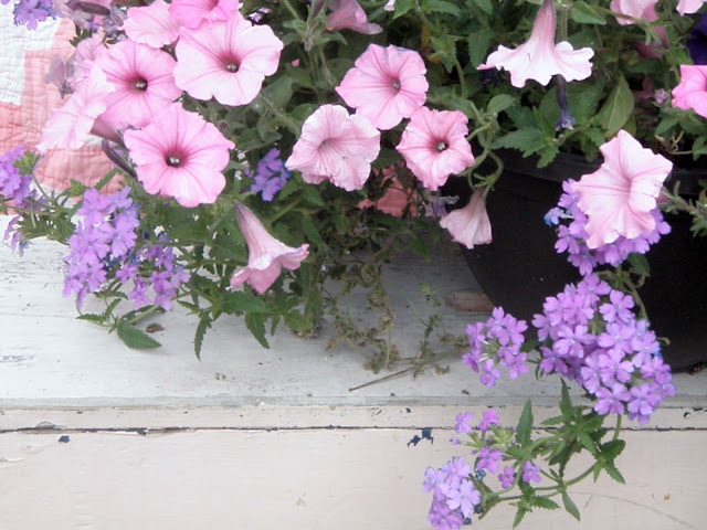 Hi J, well, you know I'm in love with that gorgeous quilt! I didn't read all the comments but I'm pretty sure that lovely lavender flower is verbena, which can withstand a lot of heat and sun if you keep it well watered. love the pinks and lavenders together. thanks so much for linking up with VIF.