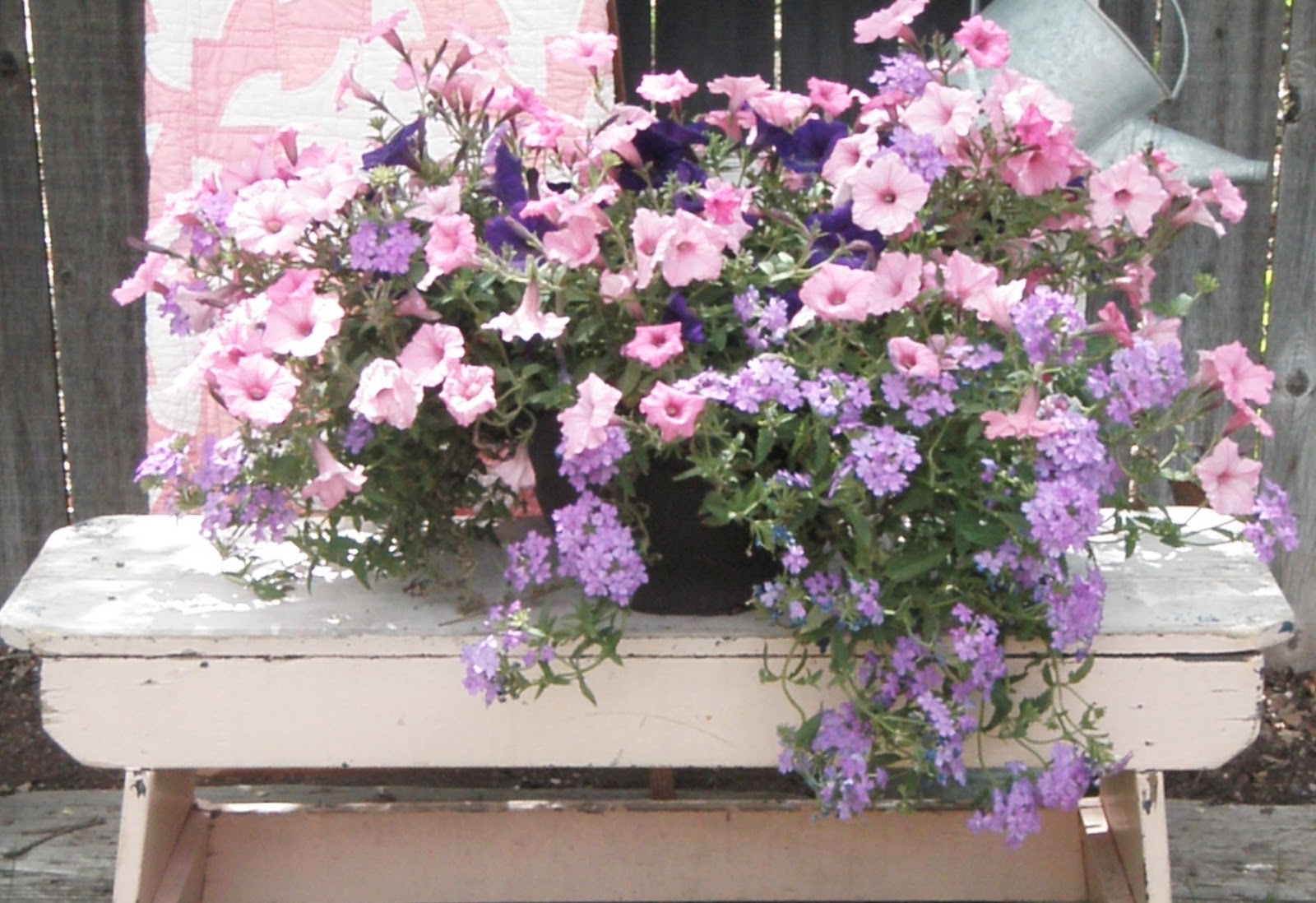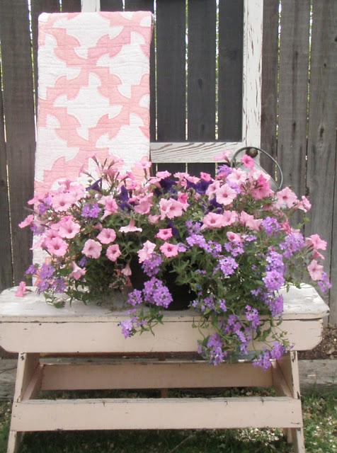 Your petunias and verbena are glorious together. The hummingbirds and butterflies will be visiting you often. Your quilt is wonderful and you got it for a great price! I just love the pink and lavender colors of spring. Such a pretty post!