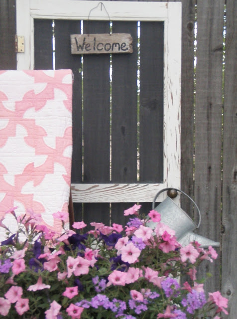 That pink quilt is beautiful. I love the pattern and it make a lovely vignette along with the welcome sign, window, bench and flowers. Gives me some good ideas.