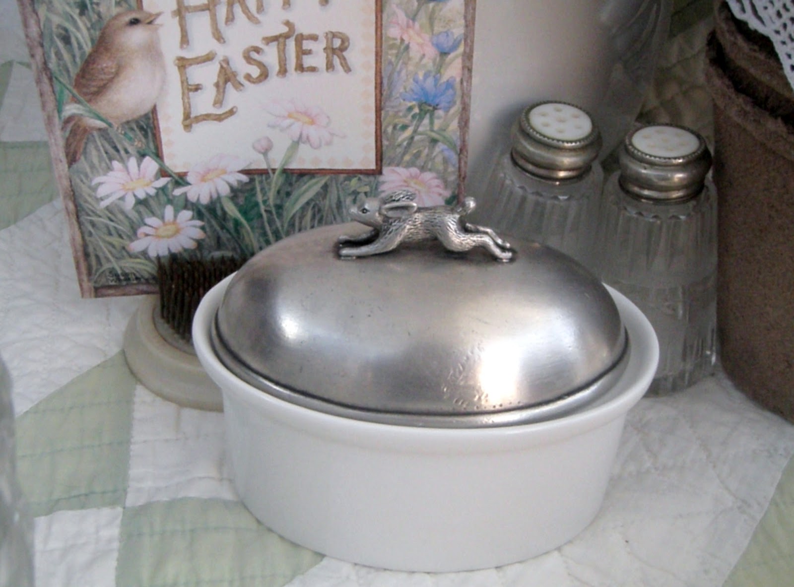 Love the Easter tablescape and the pewter lidded jam pot top with the rabbit.