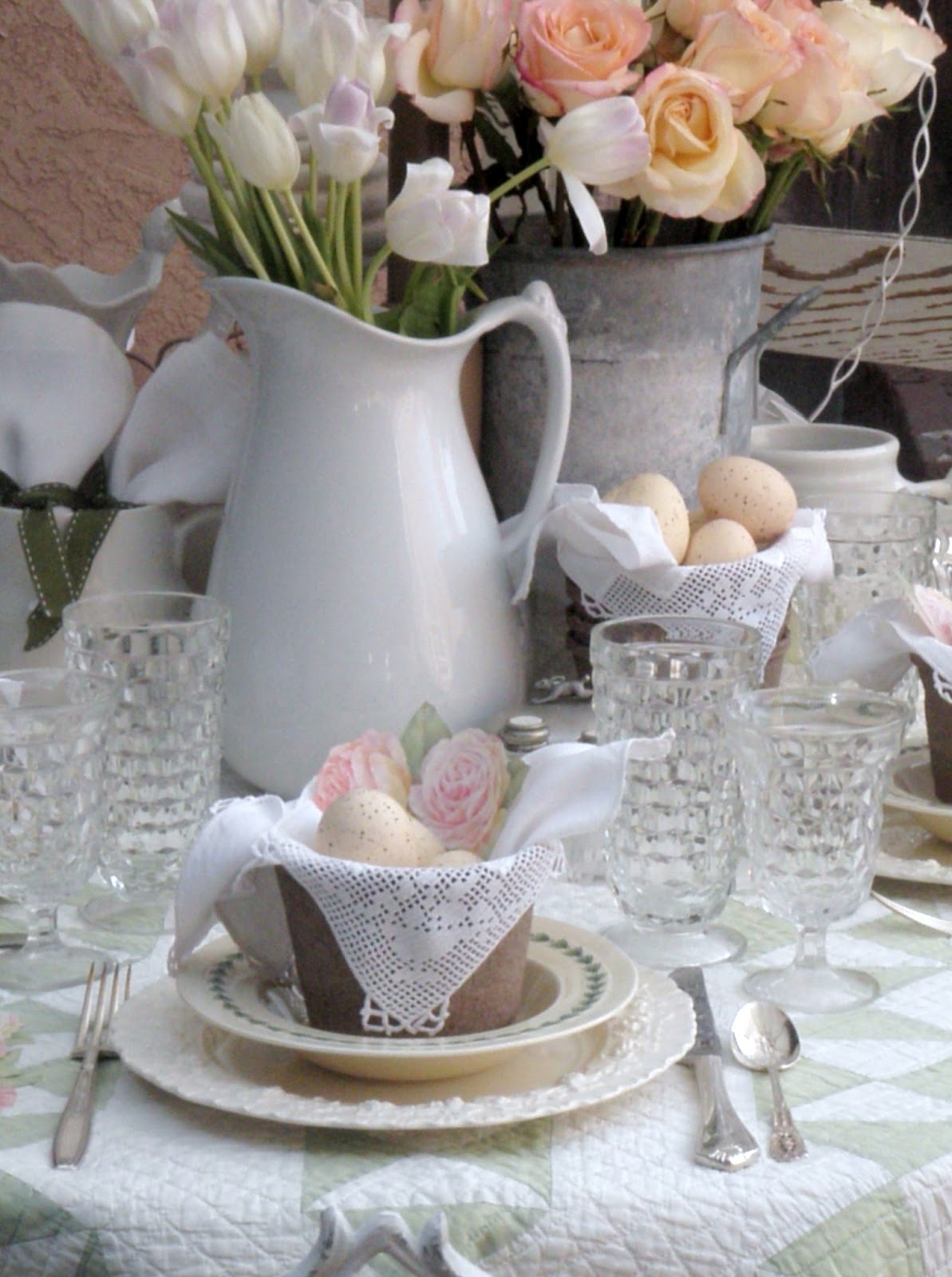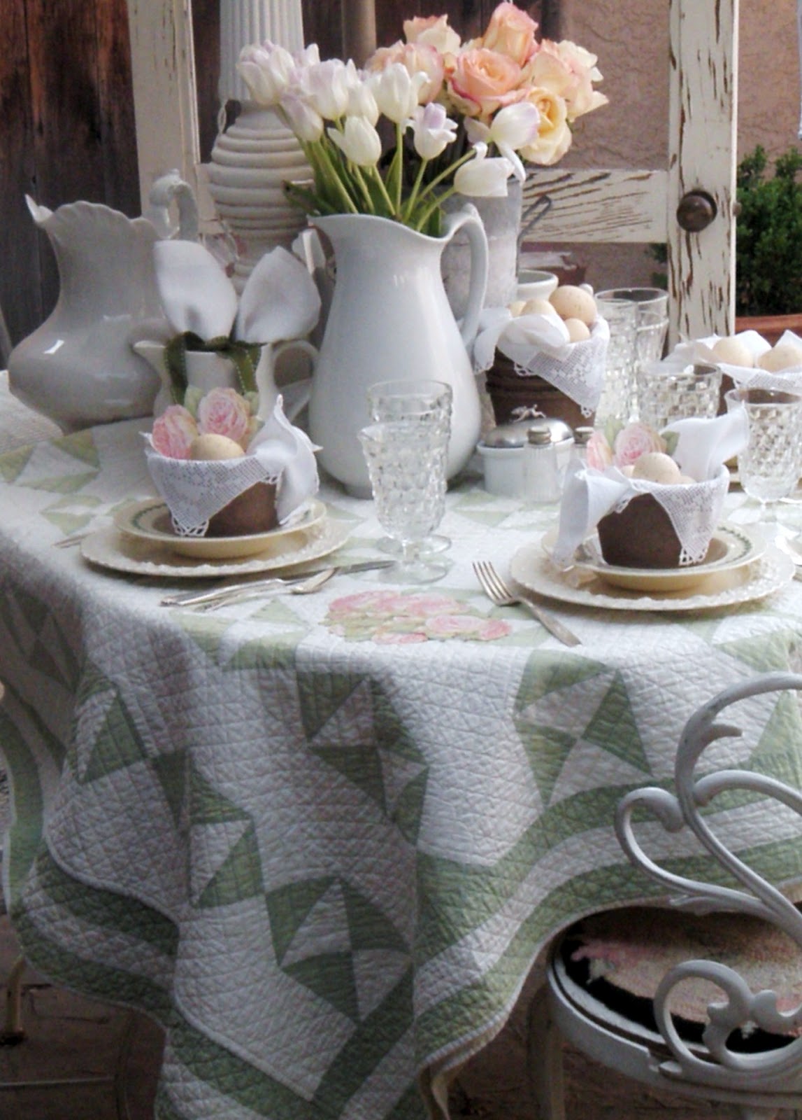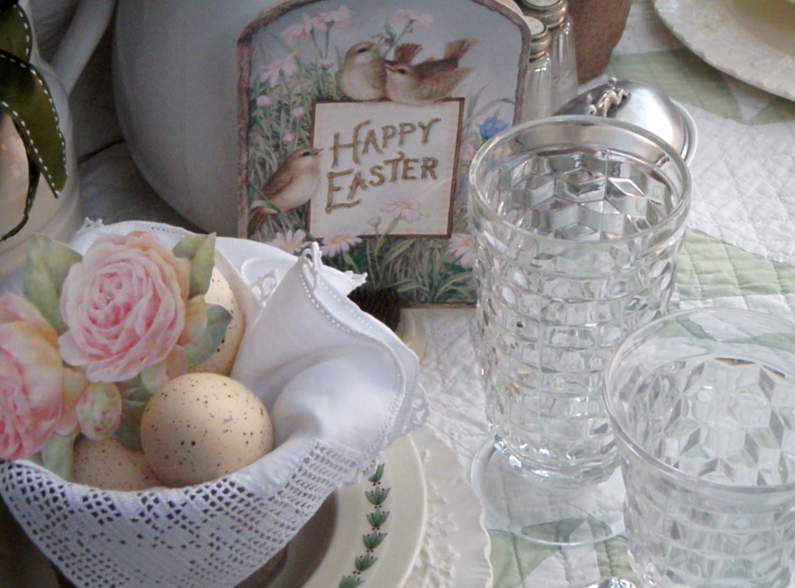 Lovely Easter table setting. The colors are so soft. That quilt is beautiful! Have a wonderful Easter celebration! :)