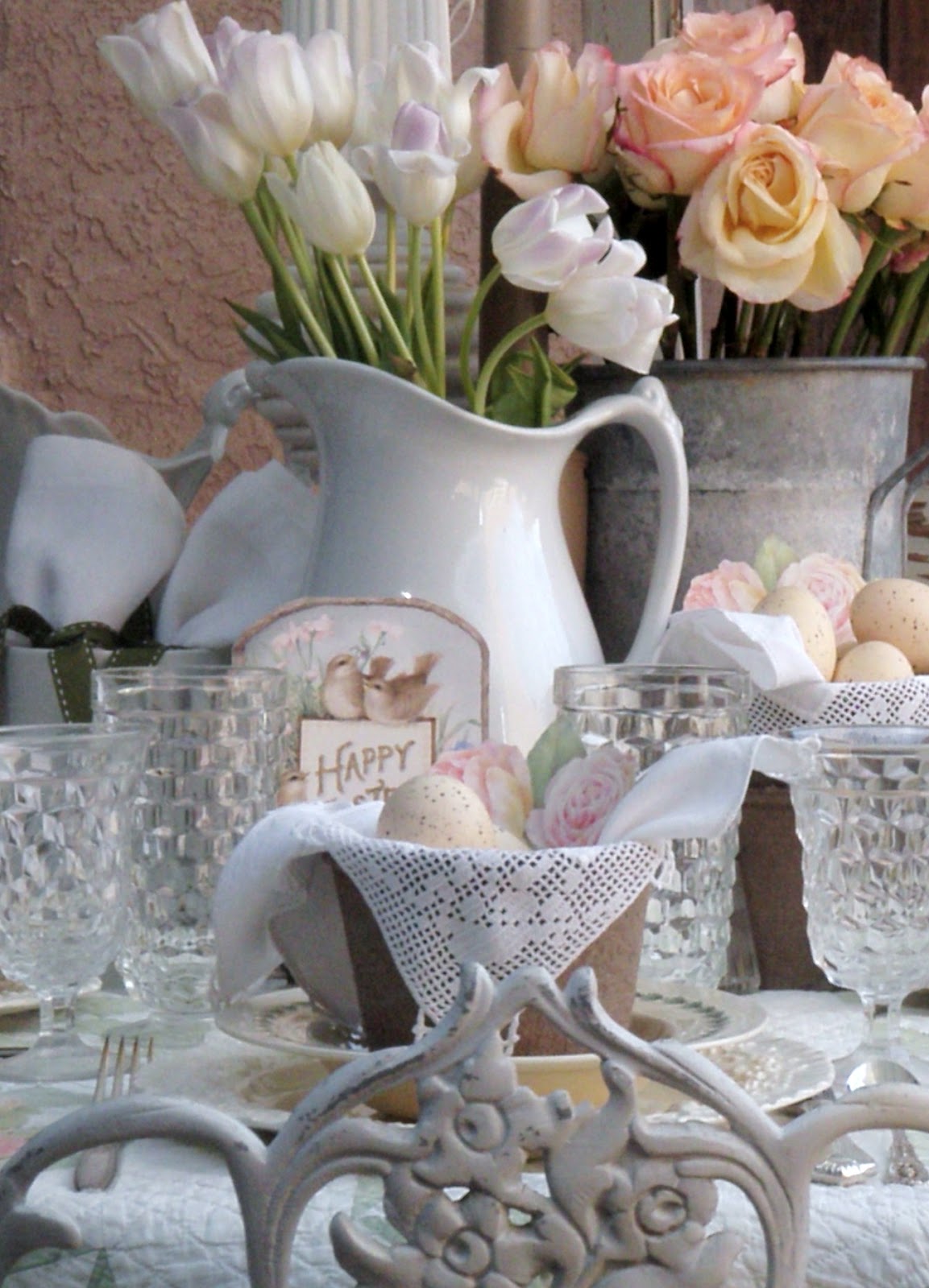 Jacquelin I adore it all I have been looking for vintage Ironstone Pitcher (with your tulips, ahhh) I wish you a blessed Easter.