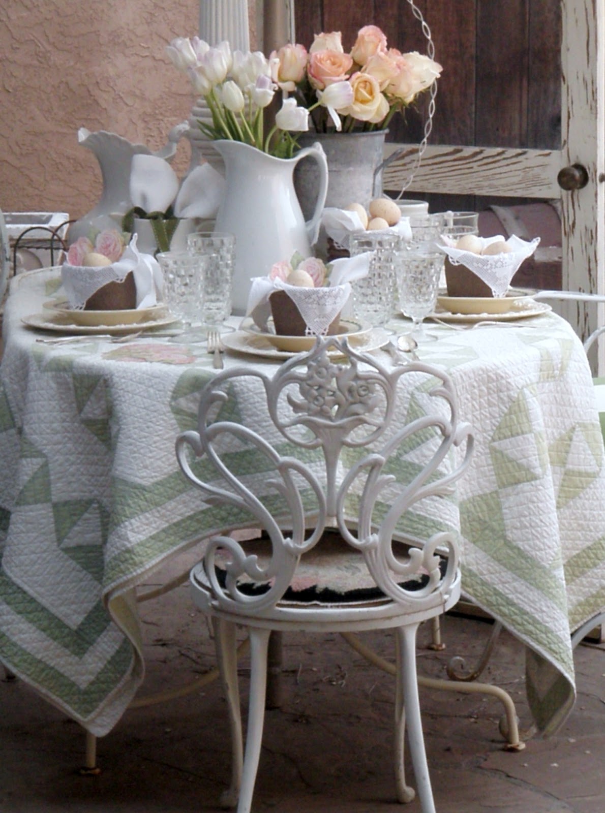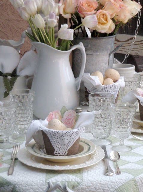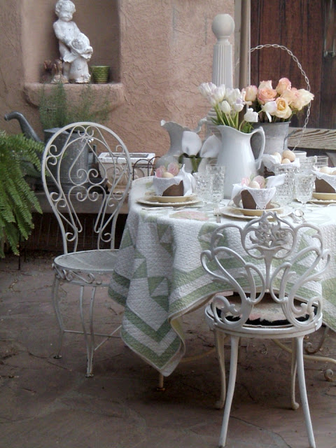 So beautiful and so nice to be able to dine outdoors. I love the soft colours and the antique quilt. We are to get a good snowfall for Easter day apparently. :( No dining outdoors for a while yet! Have a blessed Easter! Hugs, Pamela