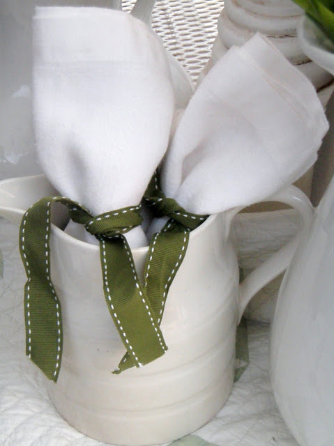 A few extra ironstone pitchers round out the centerpiece and hold the linen napkins.