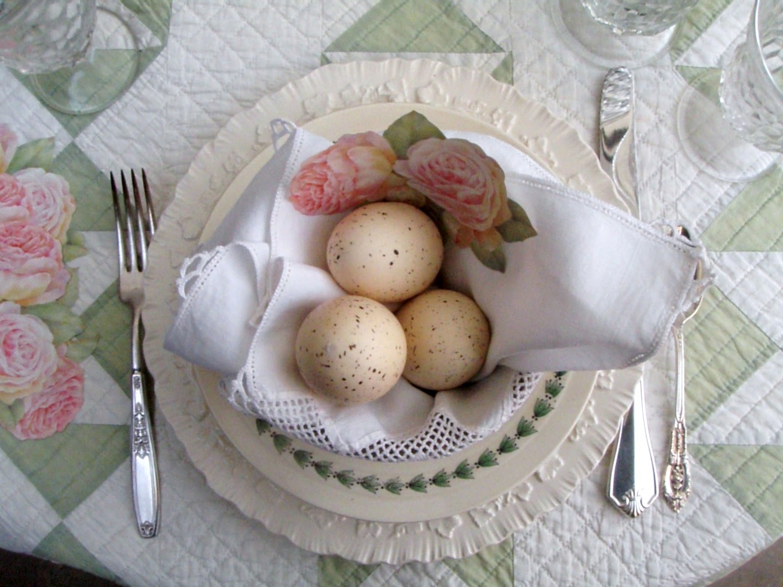 5. Lovely Easter table setting. The colors are so soft. That quilt is beautiful! Have a wonderful Easter celebration! :)