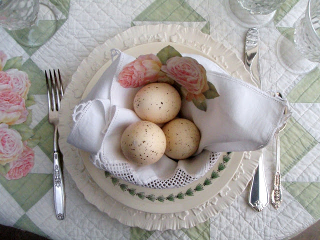 This table is beautiful. I love the idea of using your vintage quilt as a table covering too. All of your pieces look wonderful together. I wish I was going to be sitting at this Easter table on Sunday. It's simply grand!