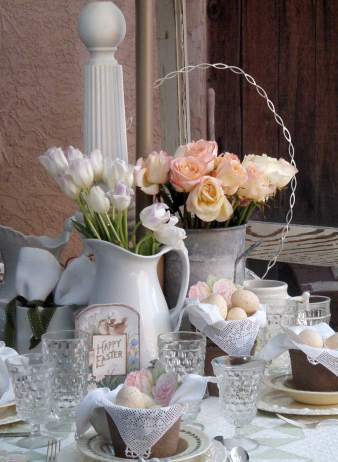 22. Simply stunning! What a very beautiful Easter table setting, love the chippy door. I could so enjoy a warm spring breeze, sipping tea at that lovely table. Happy Easter my friend. Diane