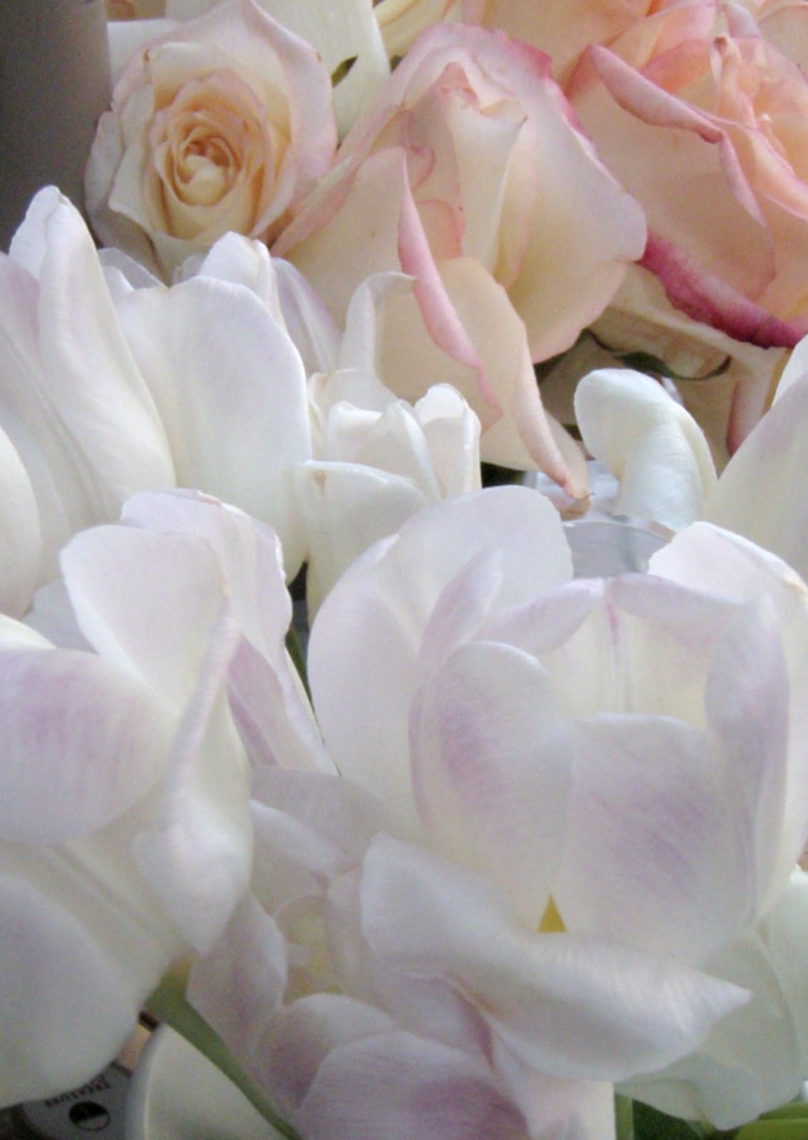 The roses and tulips are holding up pretty good, and I've enjoyed seeing them in my zinc flower bucket and ironstone pitcher all week. I went to PB today and was inspired once again by how BIG the elements on their tables are and decided to imitate that.