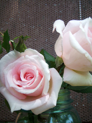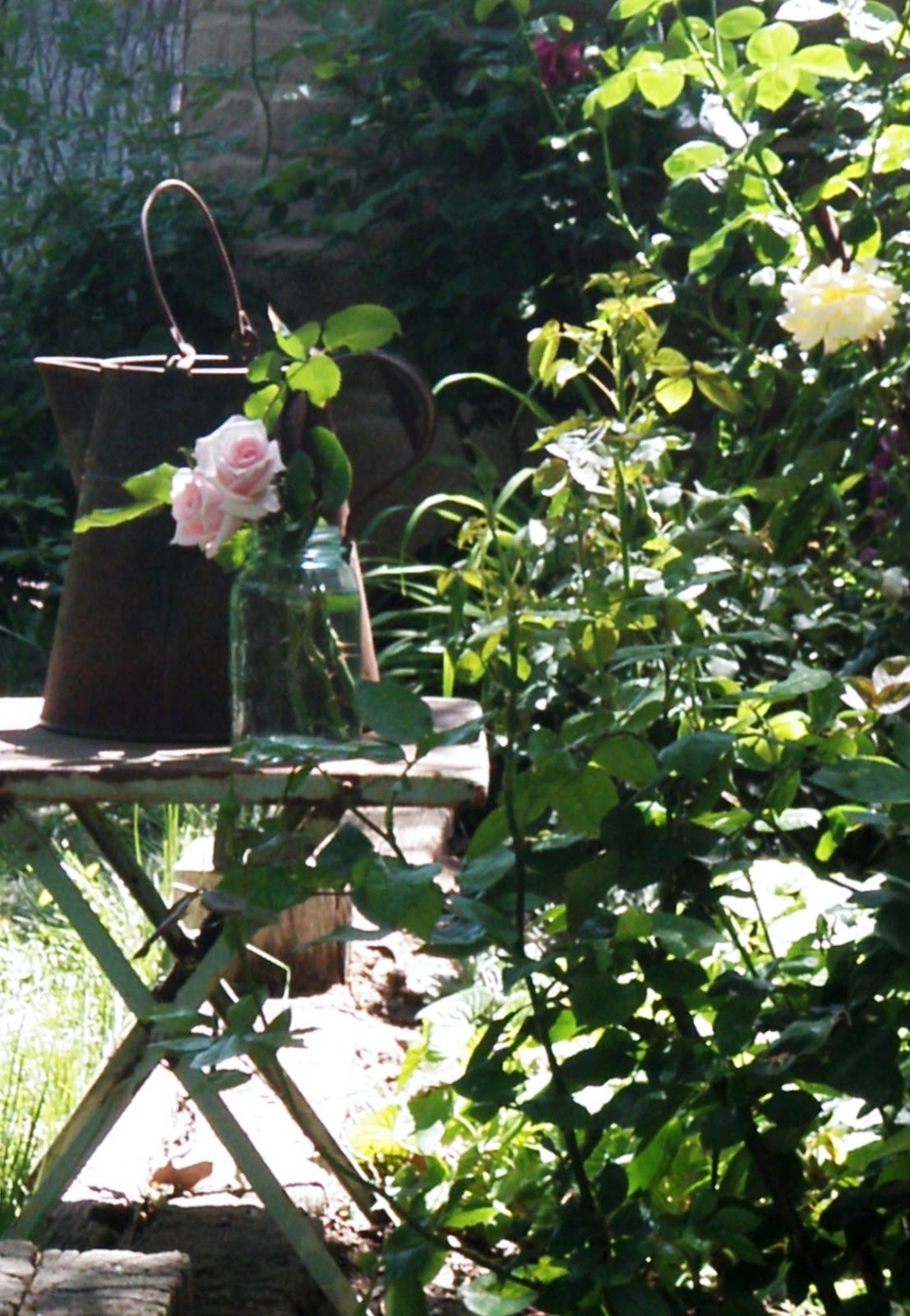The garden looks beautiful, Jacqueline. And your beautiful roses in the jar are proof that you don't need a lot of flowers or a large space to enjoy a cutting garden. I have tiny nosegays throughout the house right now with violets, lily of the valley, tiny pieces of phlox, and sprigs of "Pot o' Gold". I so enjoy all the lovely pictures you post. They always make me feel as if we've just had a lazy, garden-drenched visit!