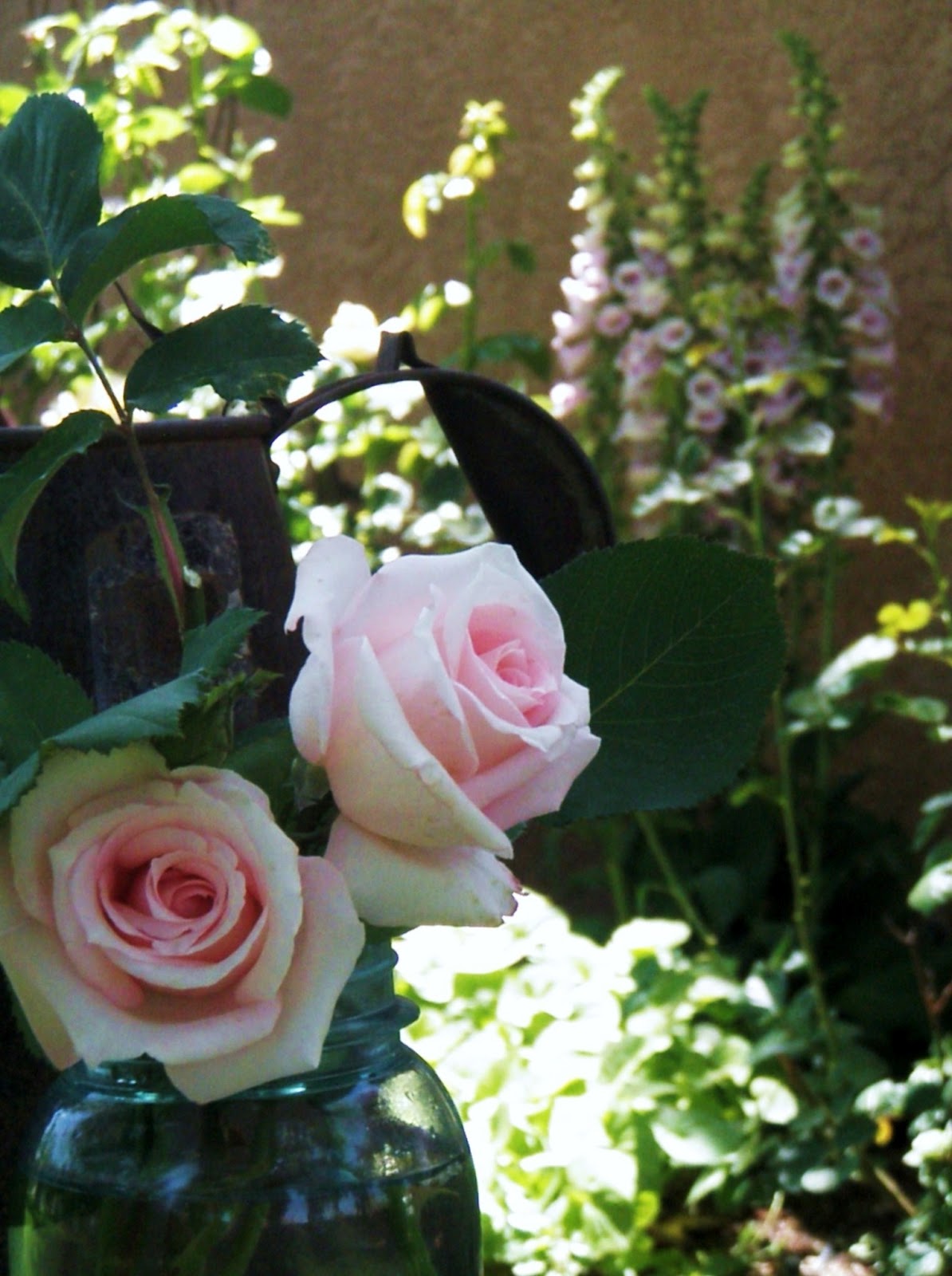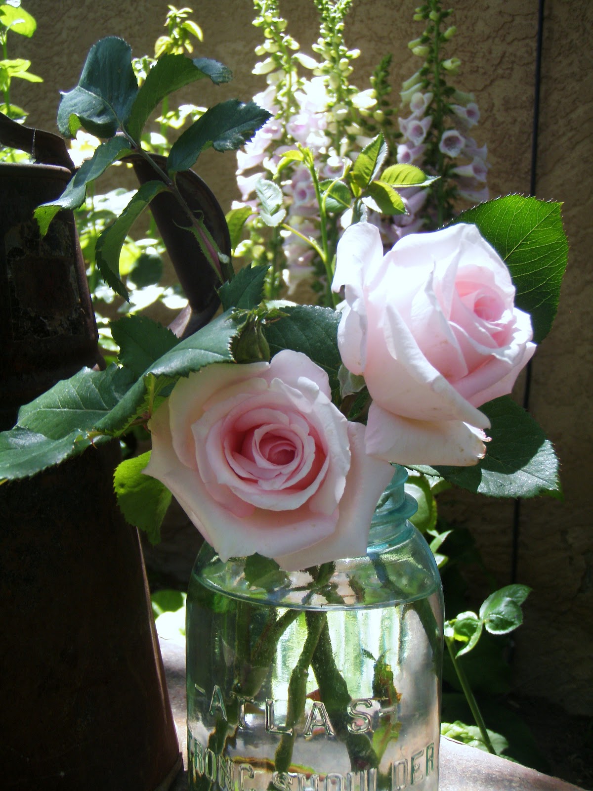 Gorgeous Roses! I love your two in the blue jar for they are so perfect. The foxglove are so lovely! I now hope to see some in Oregon for my son lives there and God willing my huband, collie, and I will be there this summer. I was excited to view your garden for I have been to your blog before and love your vintage pieces like the old coffee pot shown in the photo. Beautiful flowers and Photos! Pam