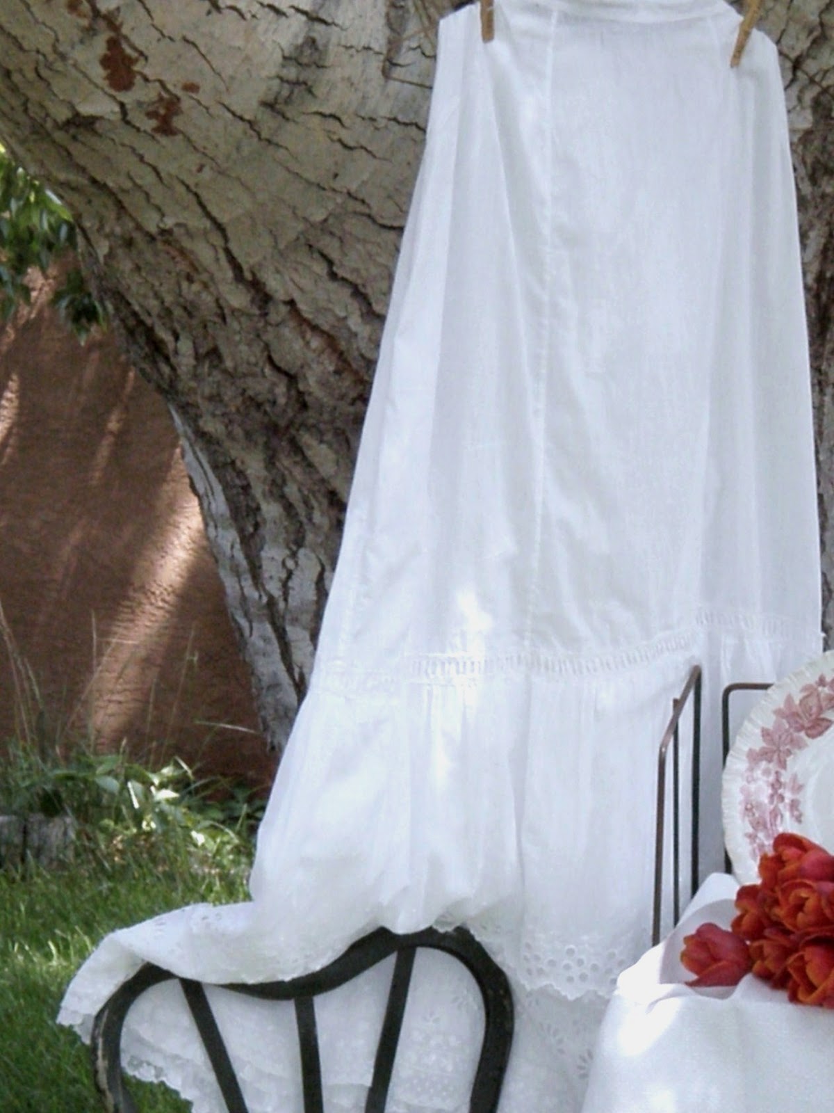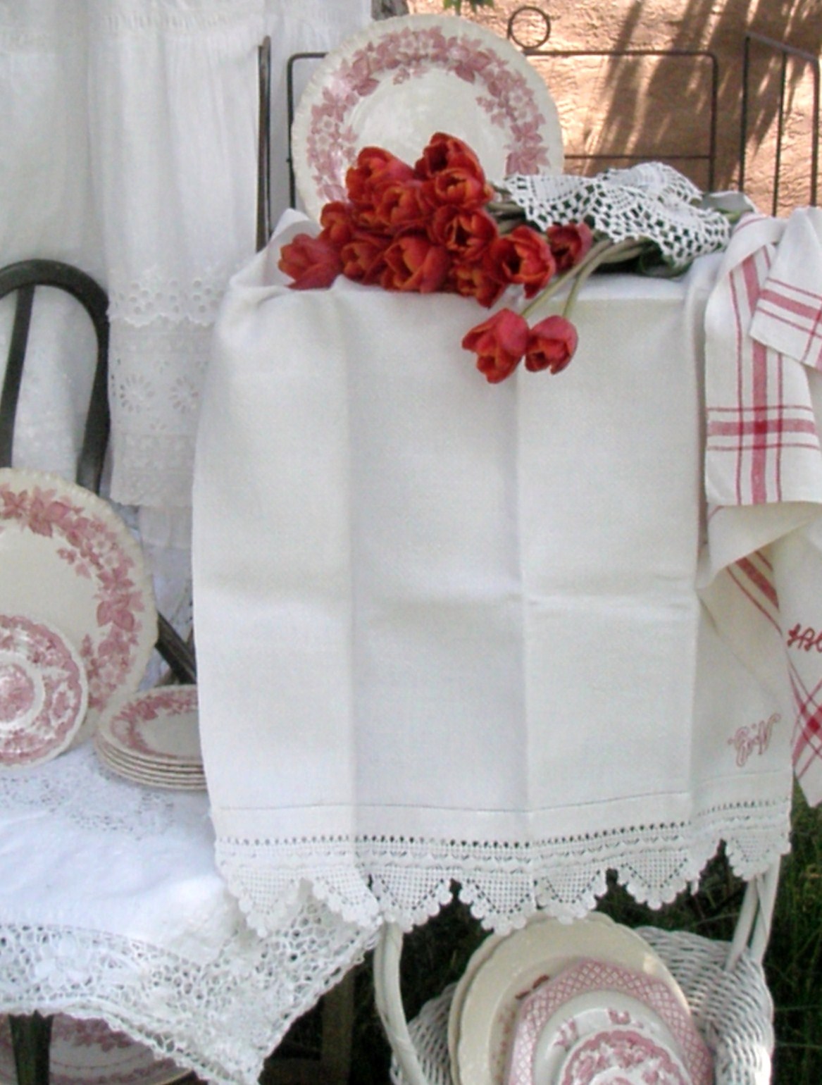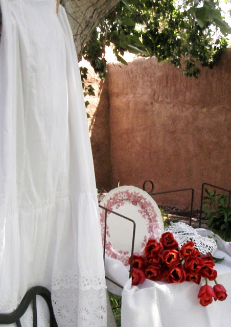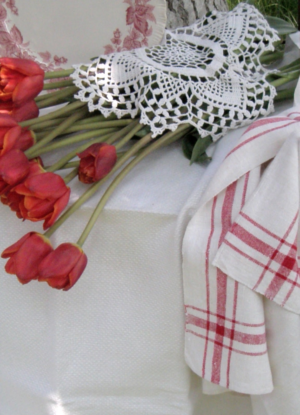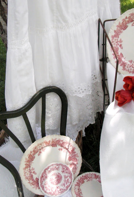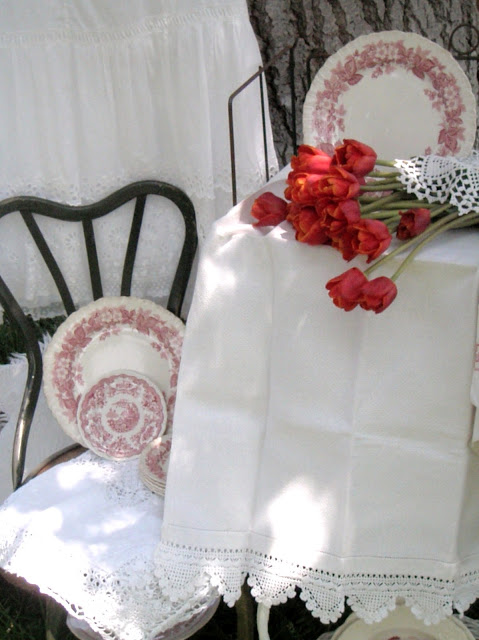 I love the red tulips next the the red plate and the white cotton skirt is simply delightful.. so pretty