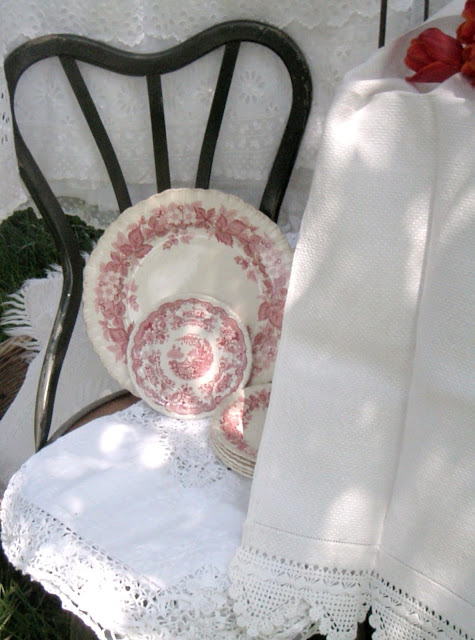 As always I love your beautiful linens and the red transferware plates are so attractive.