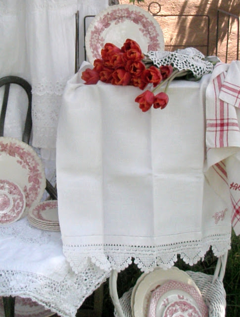 Wow, your linens are so lovely. That's a collection I would love. I like how you paired it with the red china. Beautiful