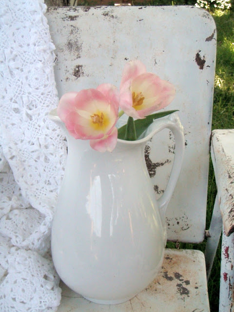 The chippy, rusty chair is the perfect backdrop for your pretty pink tulips. I think my neighbors get confused when I bring "trash" INTO our house. Beauty is in the eye of the beholder. :@