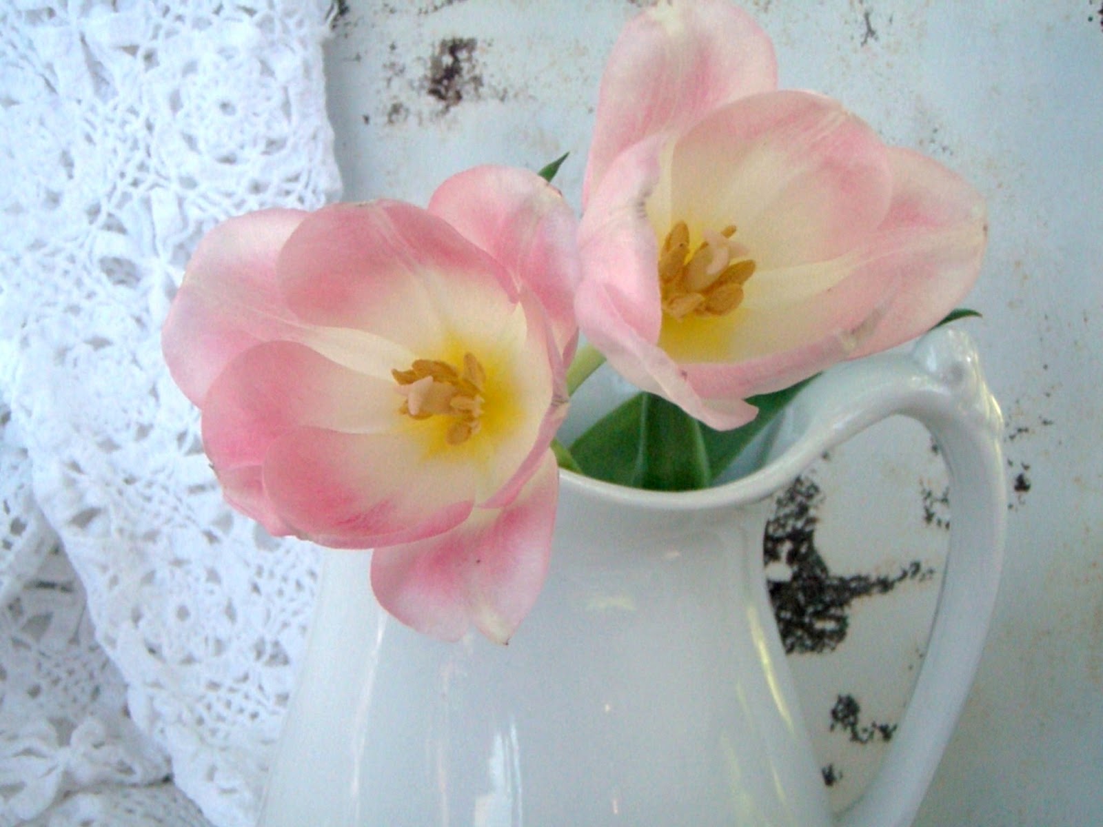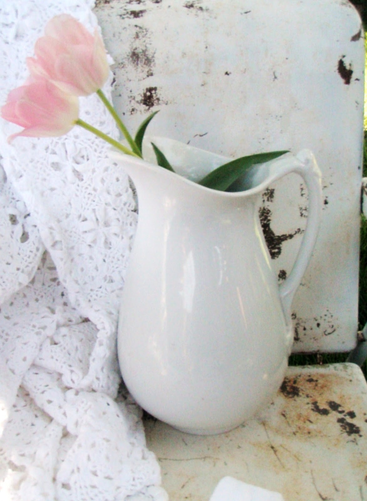 Love a bit of rust and a bit of chippy stuff. With the elegant tulips and lace to dress it up,who couldn't possibly like it? xx