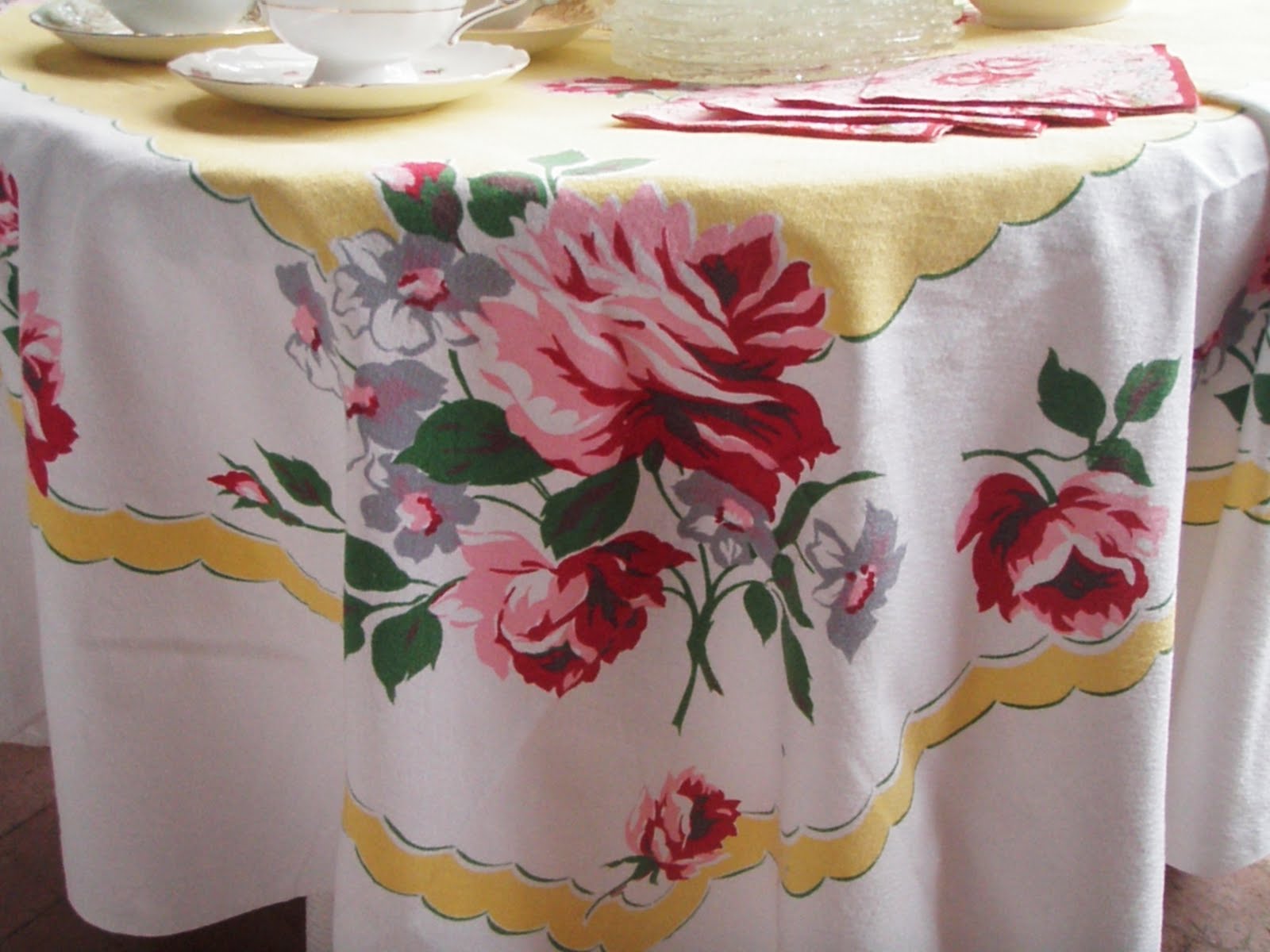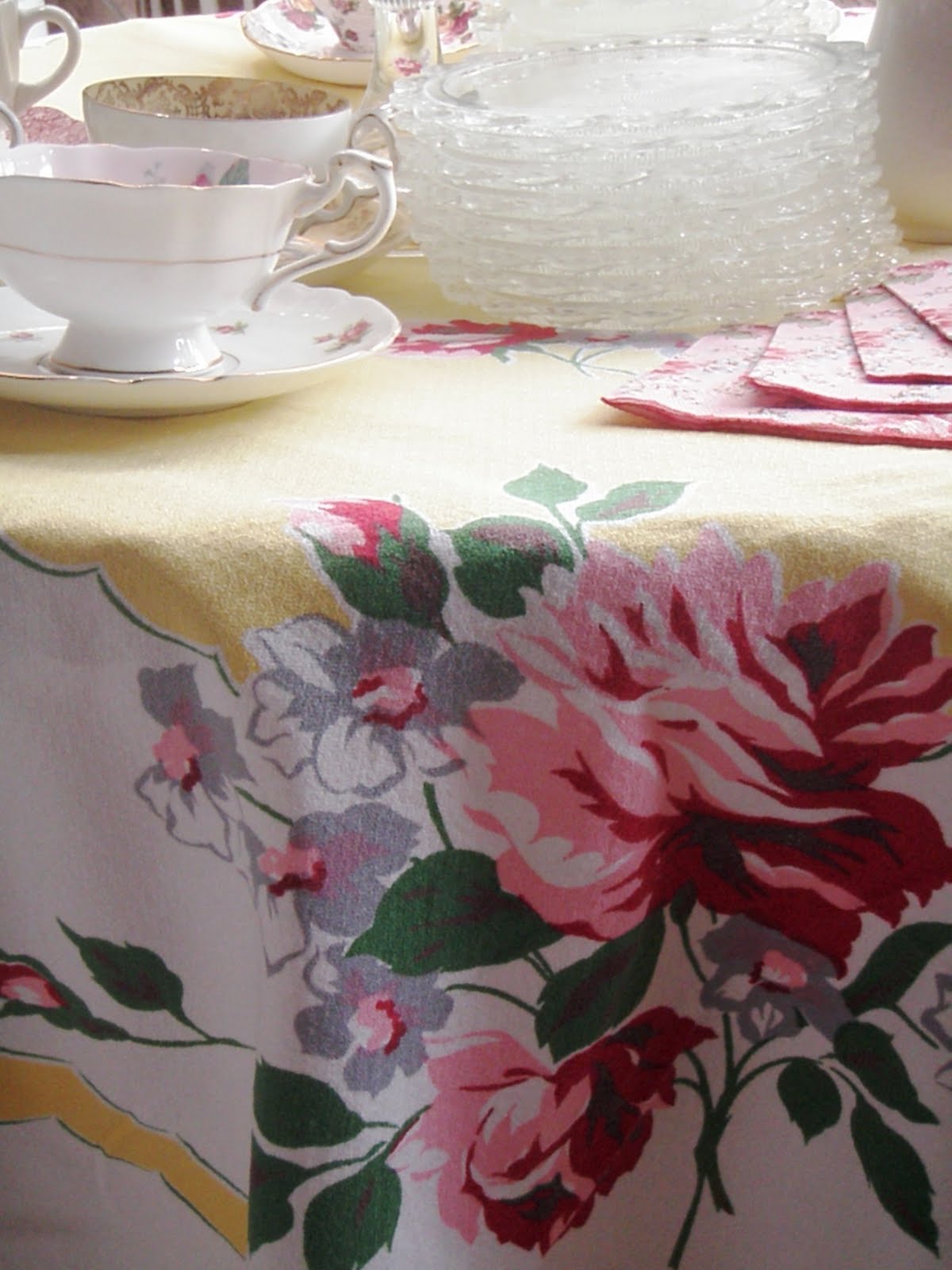 I never tire of seeing beautiful roses. I have enjoyed yours. your teacups are so pretty, especially the one with the bird. That tablecloth is stunning. I might have to start looking for some. Thanks for sharing your tea setting. have a wonderful Memorial Day week-end. Linda