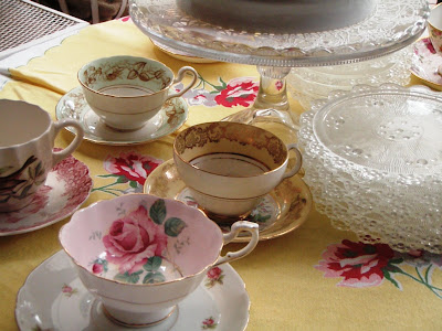 Oh, my gosh! I own the cake plate that goes with those glass dishes! Fabulous! What a pretty tea setting! All those floral tea cups are so lovely!