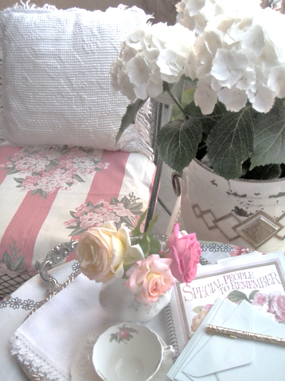 I've known for some time what a schizophrenic decorating style I have. It takes on multiple personalities. One of them loves English cottage style, all rosy and chintzy, and lately, with pale pink stripes! The closest I've come to achieving this look so far has been isolated to my decked out summer patio. . . .