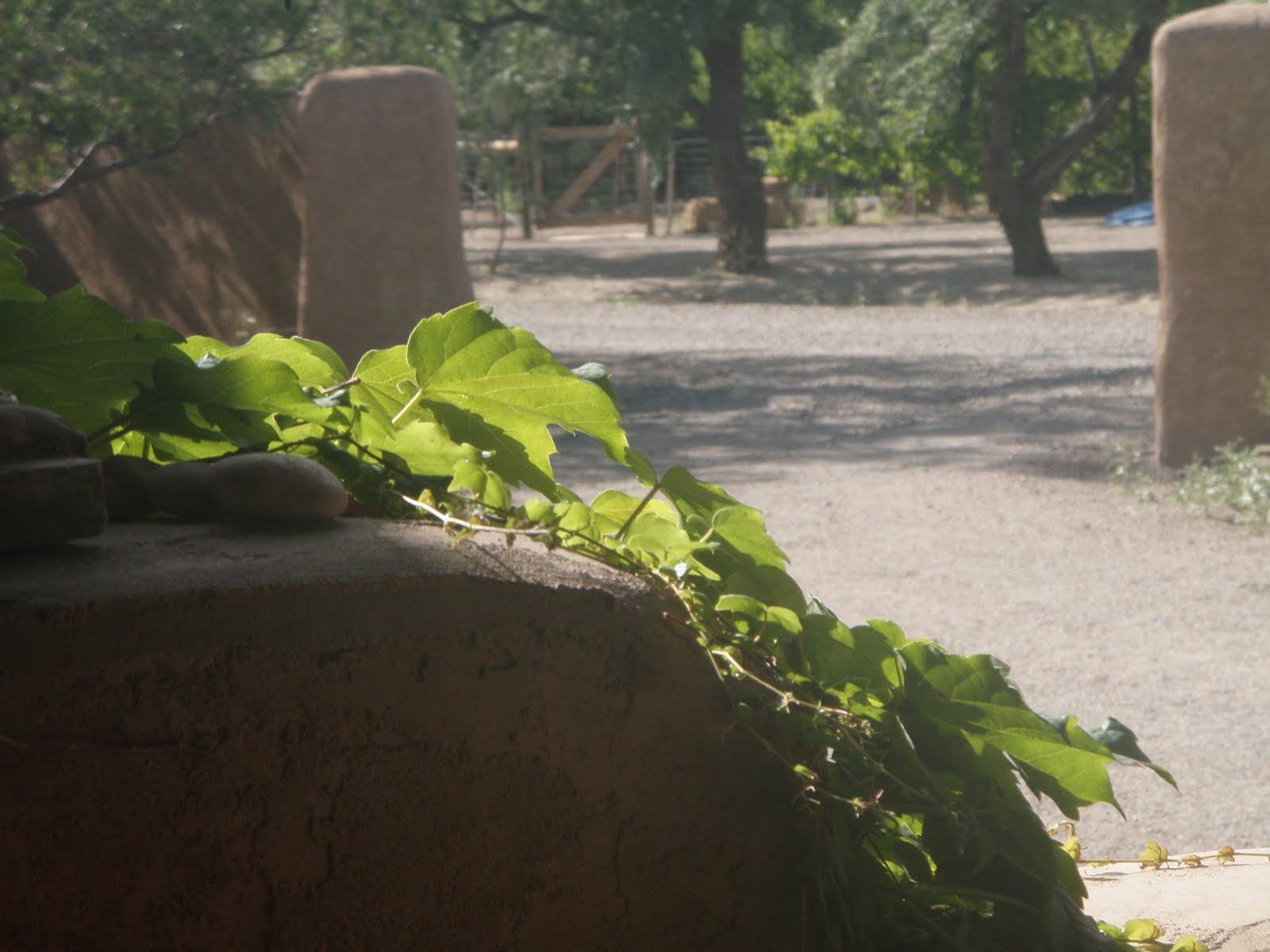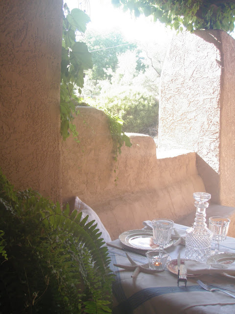 Supper in the cool of the day along the stucco garden wall under a canopy of leaves.