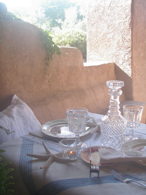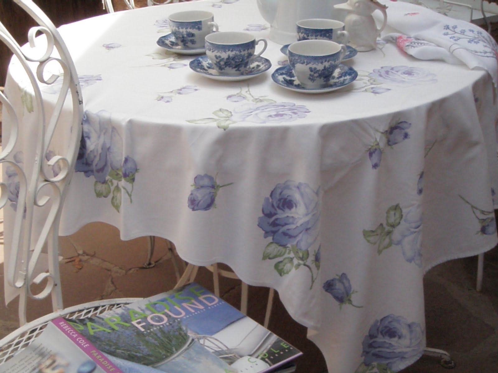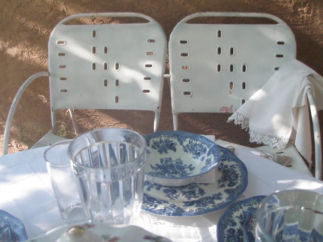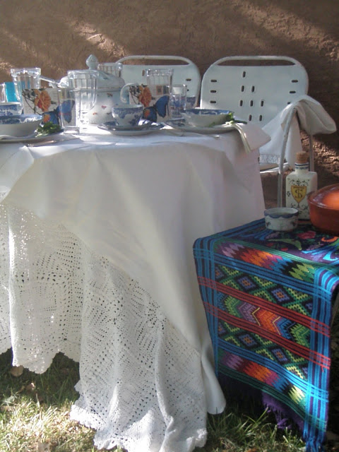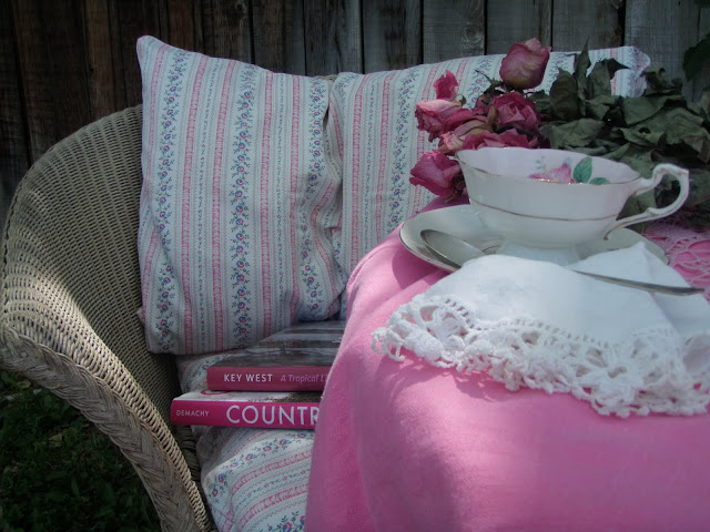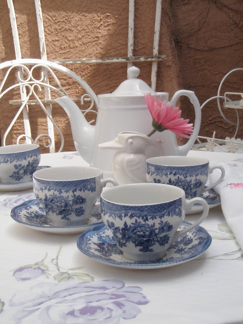 You really do have the most beautiful china and fabrics. I must look and see whether I can find any vintage coverlets to use outside on my wooden seat.