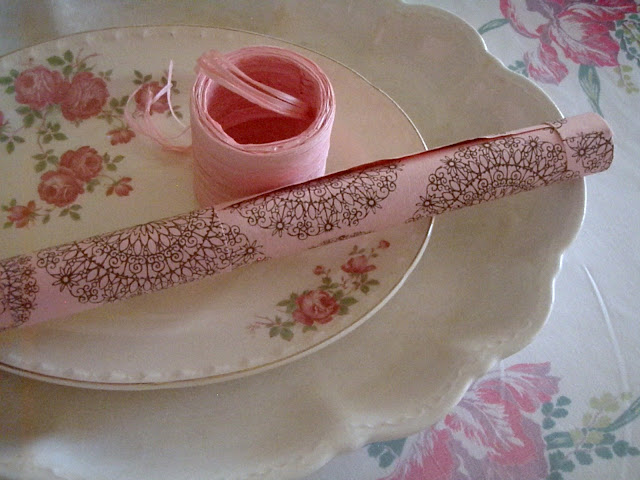 It's easy to dress up plain dishes by mixing in your other collections. Two of my favorite platters are stacked up here. World Market had this India pink wrapping paper and raffia that I found irresistible.