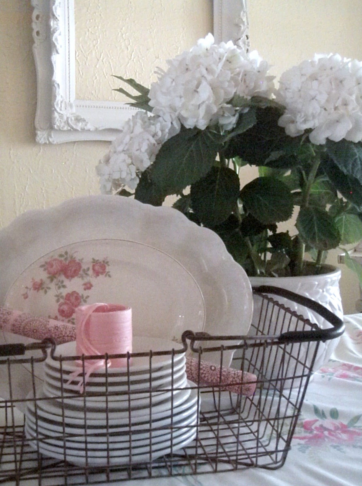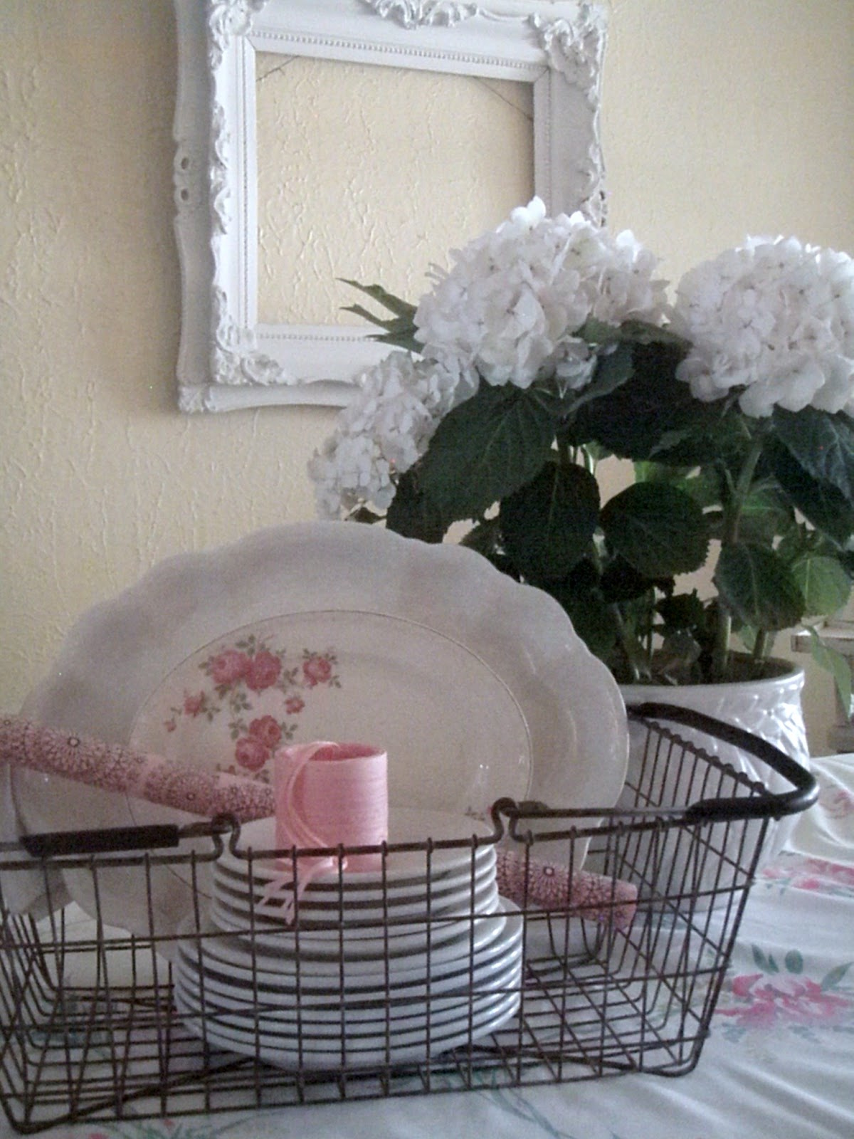 i love the soft patina ironstone has,too:) pretty floral plate, and i love the hydrangea and wire basket!