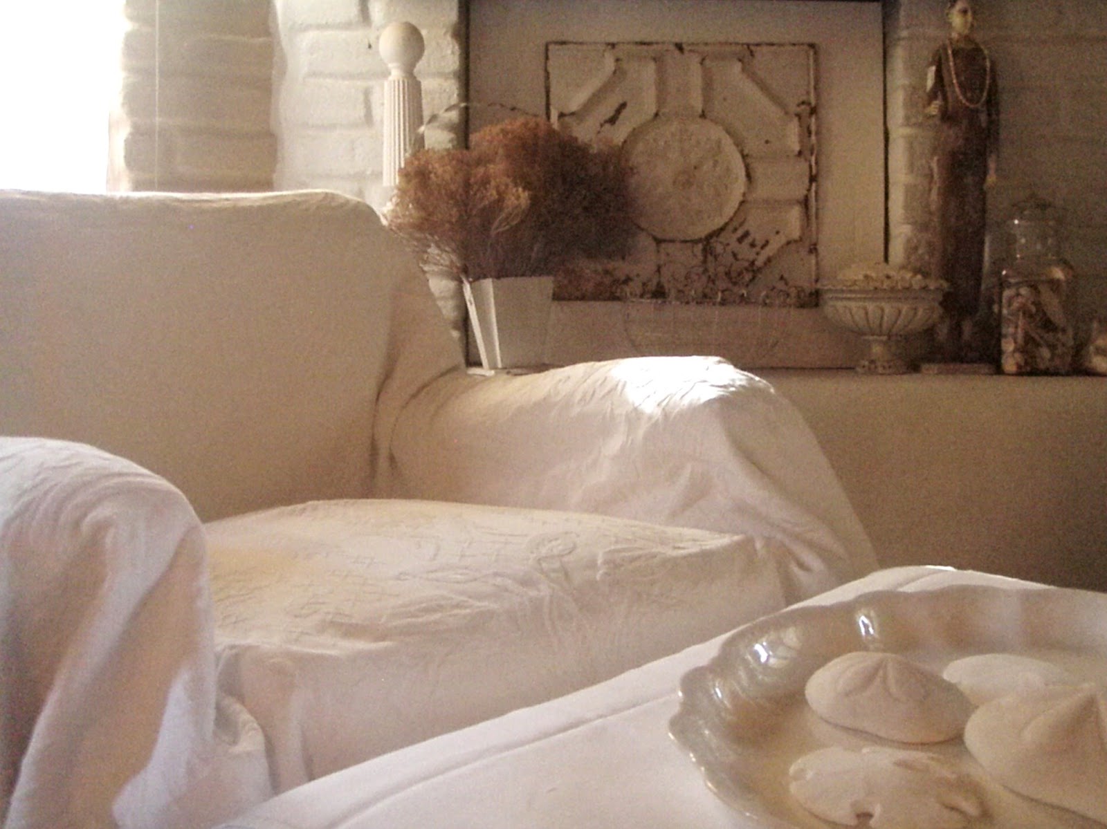 How wonderfully cool your home looks, I hadn't thought of putting white cotton throws over the furniture in summer. All the blinds and curtains have been drawn during the day here as well in an effort to keep the house cool though, being England, this hot weather won't last:)