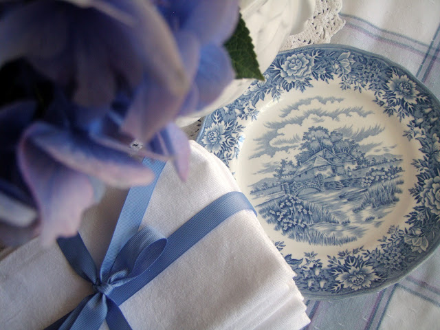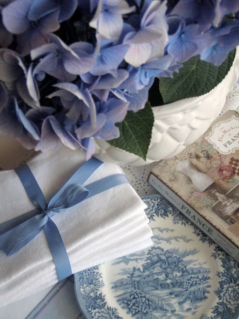 Like the saying goes, if you don't like the heat "get out of the kitchen"! OH MY, if it was ONLY THAT SIMPLE! Well, here in New England we had a BLAST of 104 a few days ago and as I LOOK at the temp RIGHT NOW just before midnight it's 56(AHHH, LOVE IT). I too love those blues for summer. Yours are gorgeous, hydrangeas are one of my favorites although OUTSIDE they don't like the heat either. They wilt a bit during the afternoon EXTREME heats. I LOVE your transferware AND I'd love to thumb through that fun Flea markets in France book!
