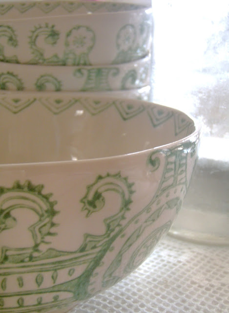 I love green in my house, the color of your beautiful bowls. The annabelle hydrangea's are turning that color green...think I will cut some and bring them in!