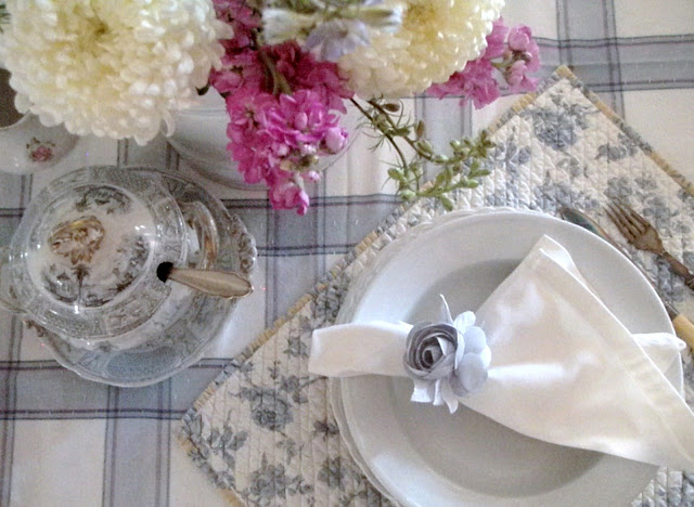 A beautifully arranged table, I especially like the quilted mats and the flowers. Your dresser is lovely as well, I have severe dresser envy!