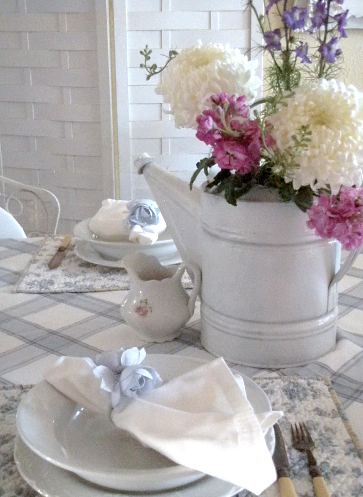 Very tranquil and pastel purity tablescape!I adore the blue plaid tablecover mixed with the floral placemats. The layers of linen beneath are so soothing! Your husband is a fortunate man to have you design a table around his favorite hue! Hope his day is spent with those he loves around your table!