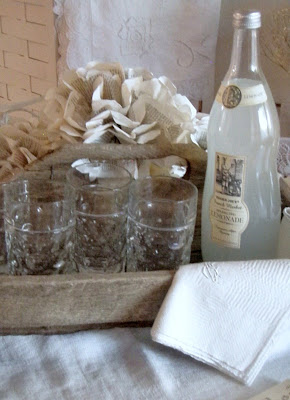 I was looking for something specific for the table and came across a couple of things I had set aside until I had time to pay attention to them. A set of monogrammed homespun linen napkins, and an antique French cloth that needed soaking. (More about soaking here.) (And here.) (More linen love here.) (And here.) (And here.)