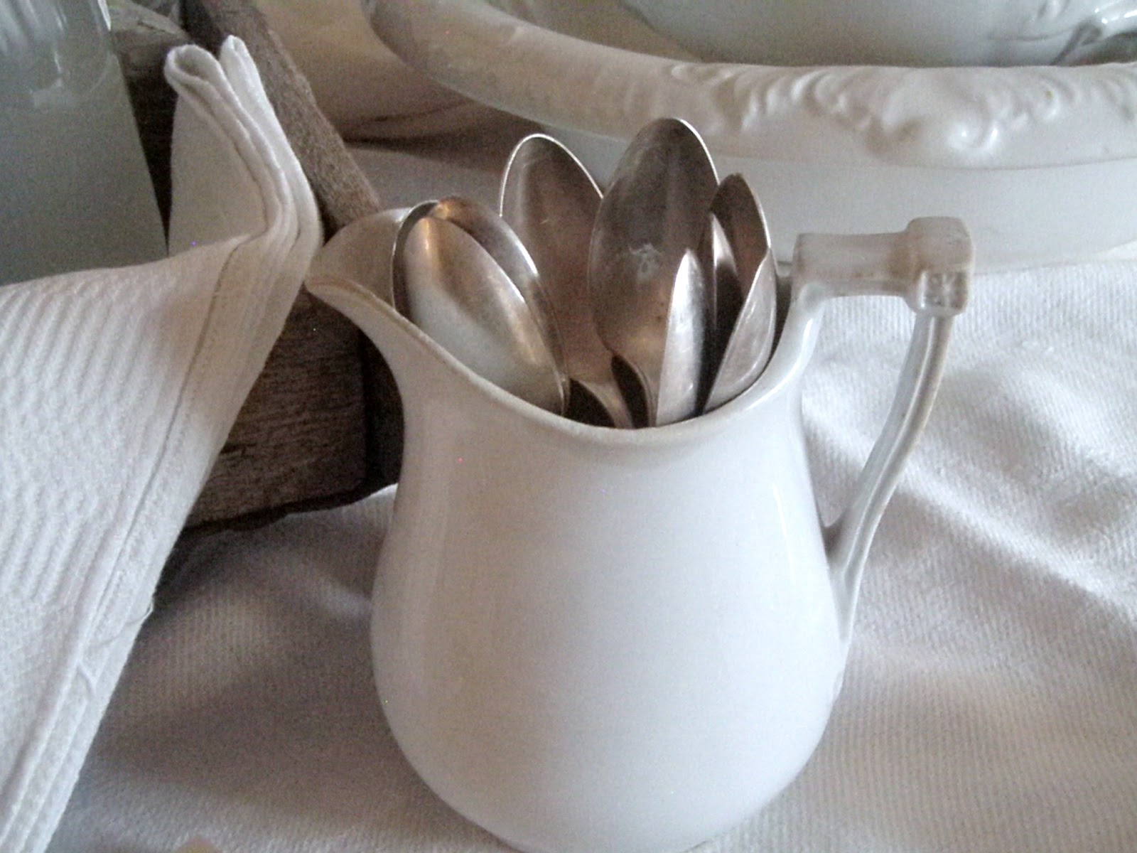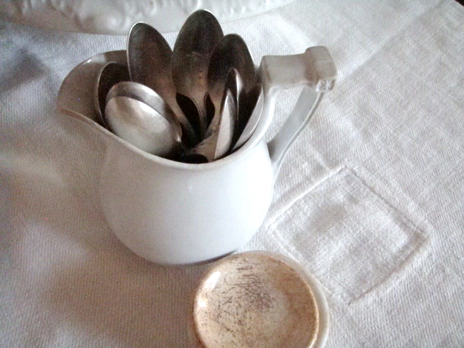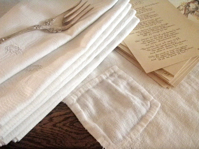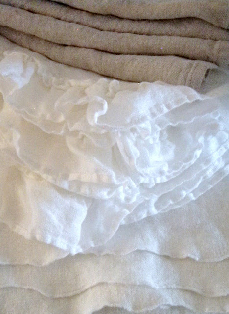 I always have piles of fresh linens that haven't yet been put away. I just like seeing them around the place. When I freshened up this small linen tablecloth I decided not to iron it. I left my PB ruffled napkins the same way last time, and wanted to see how I liked them together. The rumpled look is feeling so homey to me.