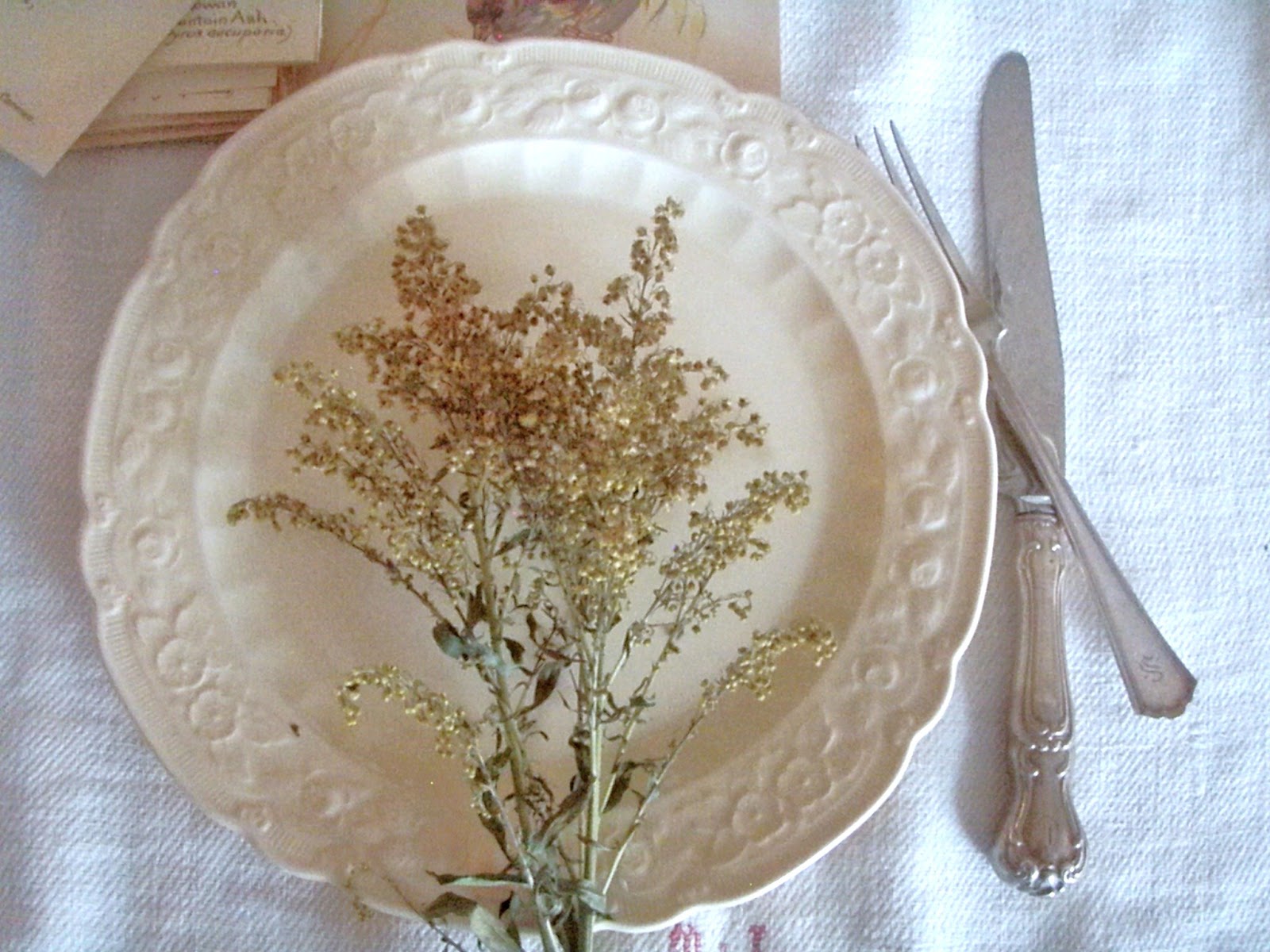 Aww: Jacqueline's back. A sign of relief! Loving those unironed linens too. I suppose you already told once how you made those flowers, well..guess I missed that. I can't wait to see your decorated harvest table..Glad you had a good vacation..Happy Weekend..Judy