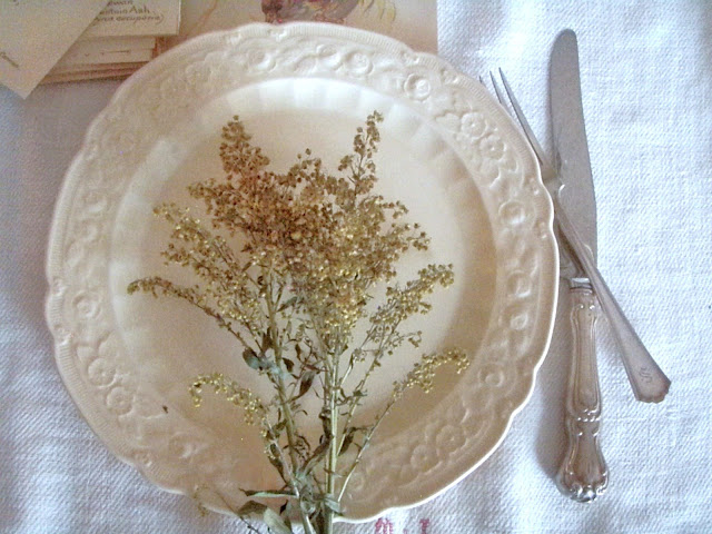 Such a lovely, comfy table, Jacqueline, with all those shades of ivory and a little amber. I love those paper flowers, and the softness of the "unironed" cloths. So pretty. It's so nice coming back home after being away, isn't it? I think our nesting intincts are never stronger.