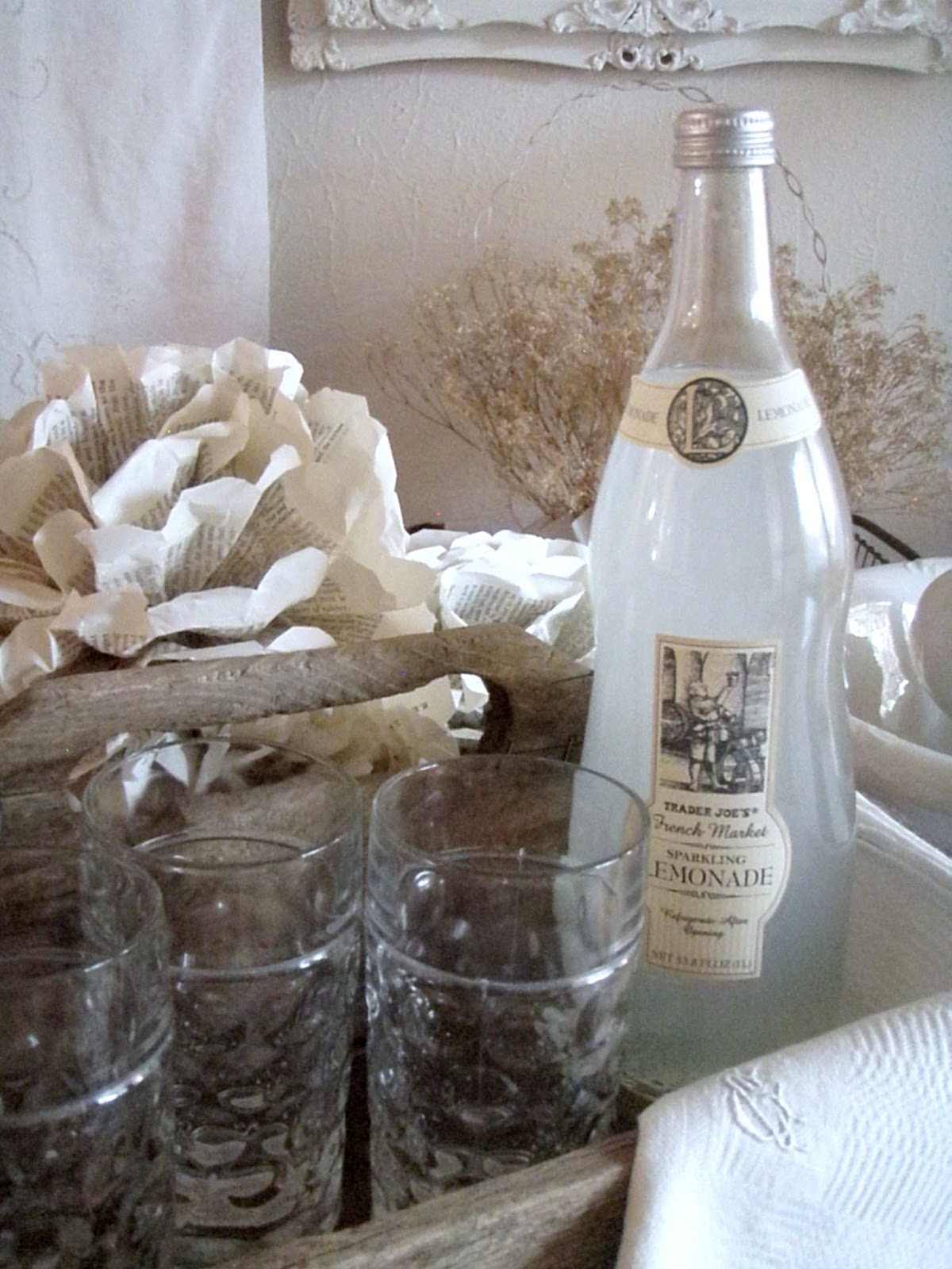 Hi Jacqueline: I so enjoyed your post today. I love all the details--the old berry box, the vintage napkins, the paper flowers, even the Trader Joe's bottle--who knew they had such a pretty bottle?? I am pinning this page for later reference!