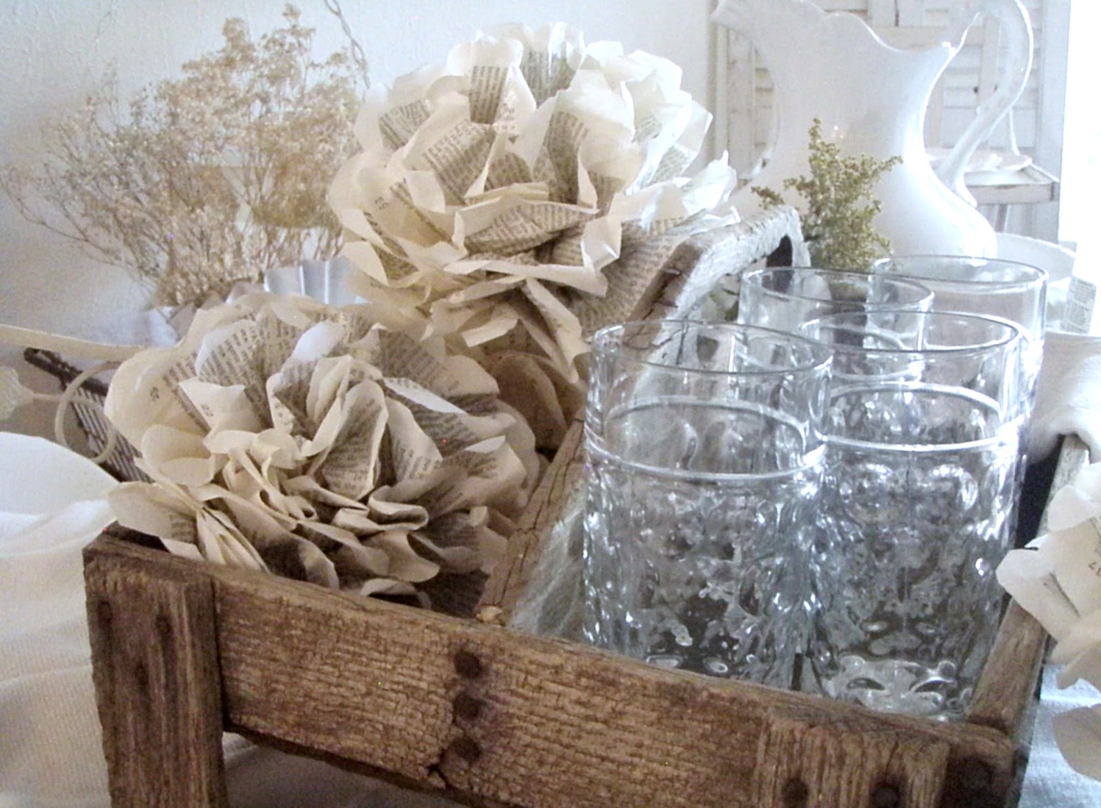 Exquisite post! The linens alone would make my heart flutter, but add in the glassware, ironstone, and silver and oh, my! You should make things more often. I adore your paper flowers. Lovely, absolutely lovely!