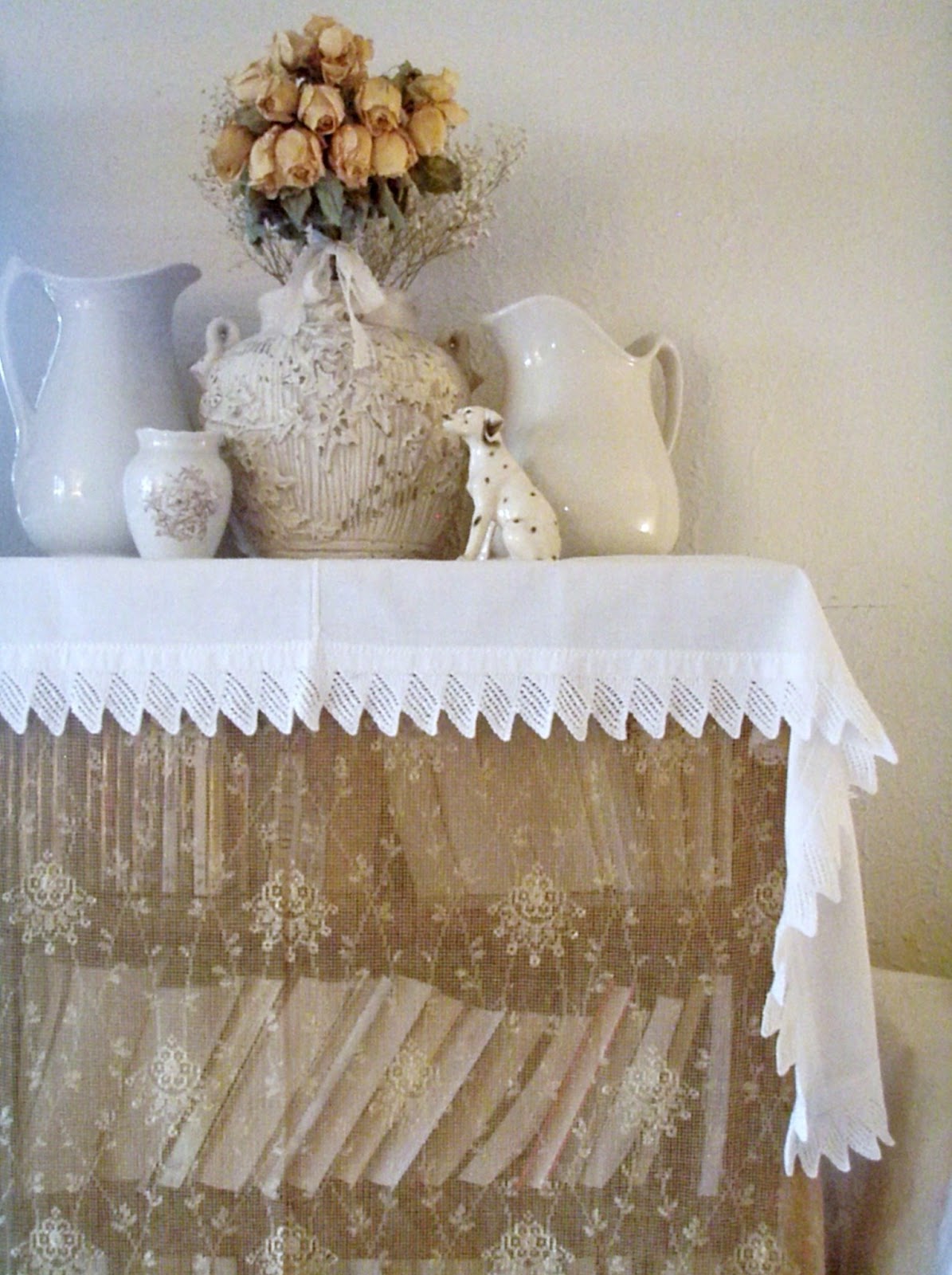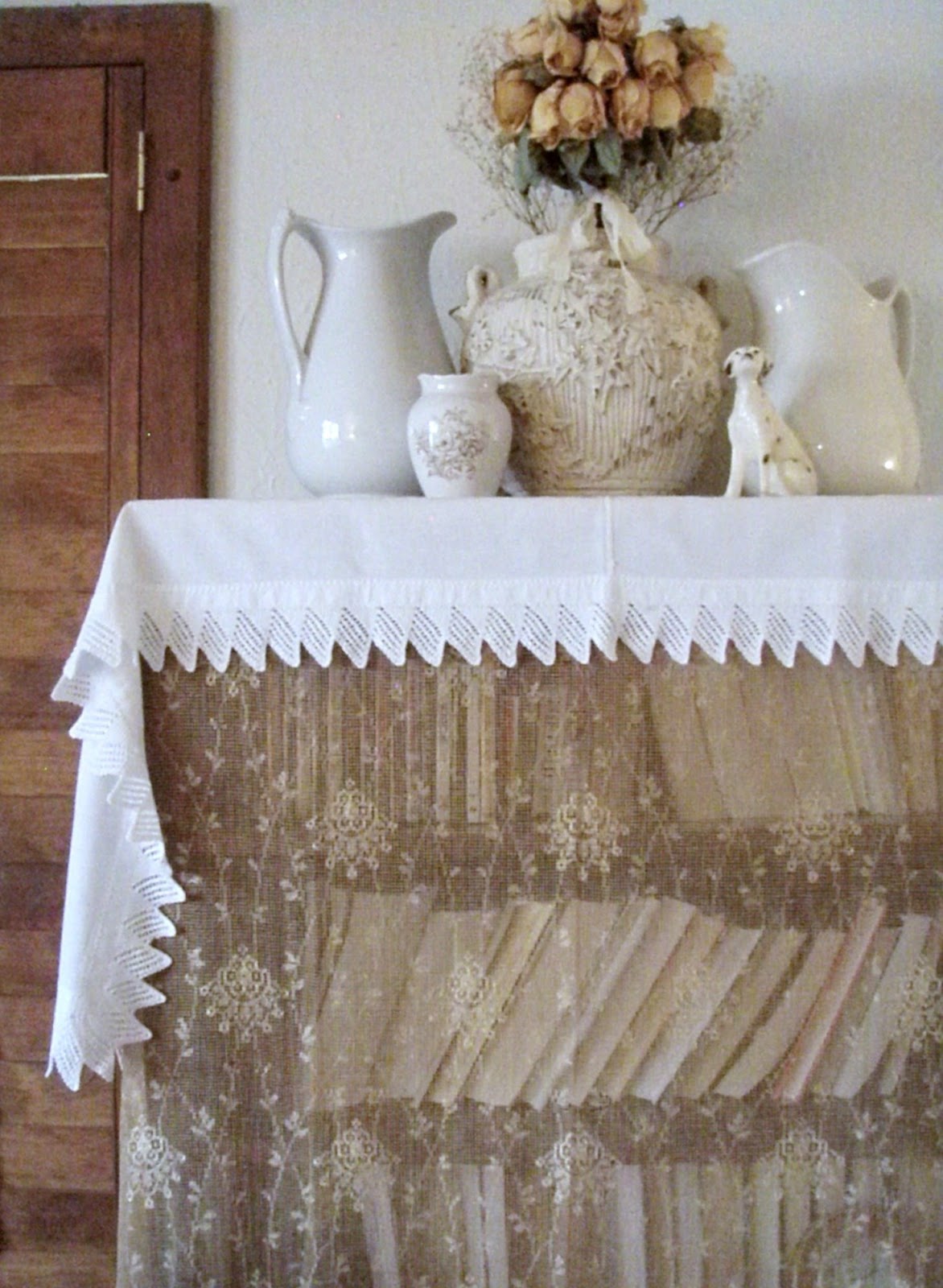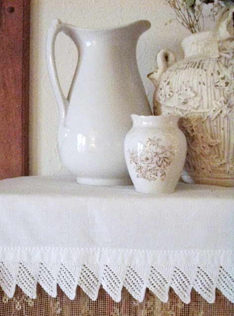 I love how you used the lace to diffuse the look of books on your shelves Jacqueline! What a great idea. Not only does it soften the look, but it shows off the beautiful pots and ironstone pitchers.